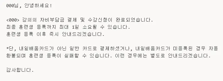 자비부담금 결제와 고용 24 수강 신청 완료 시 아래 문자를 받아보실 수 있어요.