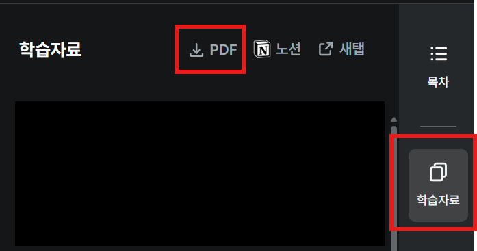 수강 화면에서 우측 탭의 학습자료를 클릭하시면 자료를 바로 확인하실 수 있어요.