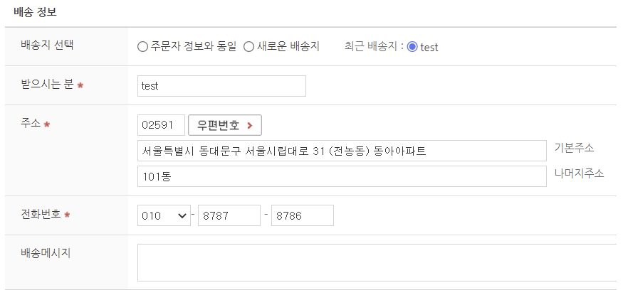 주문정보에는 판매자분의 정보를 입력해주시고