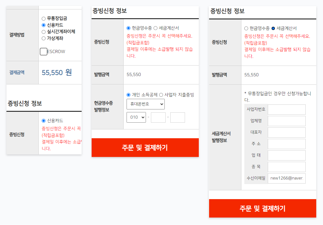 주문서에서 실시간 계좌이체 및 가상 계좌를 선택 후 결제방법 밑에 [증빙 신청 정보]에서 세금계산서 또는 현금영수증을 선택하셔야 발급 받으실 수 있습니다.