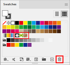 삭제 방법은 견본(Swatches) 창에서 우측 하단에 별도 표시가 있는 색상들을 선택하여 휴지통 버튼을 눌러 삭제 해주시면 됩니다.