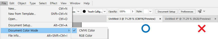 작업시 색상은 CMYK를 기본으로 작업해주셔야 하며, RGB, PANTONE, DIC, 사용자 정의 색상등을 사용하시는 경우 먹(100%)으로 인쇄되거나 원하지 않은 다른 색상으로 대체되어 인쇄될 수 있습니다.
