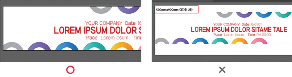 디자인과 대지(인쇄영역)의 위치와 사이즈는 동일하게 설정해 주세요.