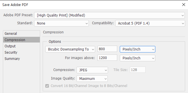 포토샵 파일은 pdf로 저장해주시기 바랍니다. eps로 저장하실 경우 도큐먼트가 인식되지 않아 오류가 발생합니다. pdf저장시 Compression 옵션에서 해당소 값을 조정해주지 않으면, 작업을 800이상으로 하셨더라도 300으로 저장 되실 수 있습니다. 현수막 파일은 800 ~ 1500으로 설정 해주시고, 그 외 파일은 100 ~ 150으로 설정 해주시기 바랍니다.