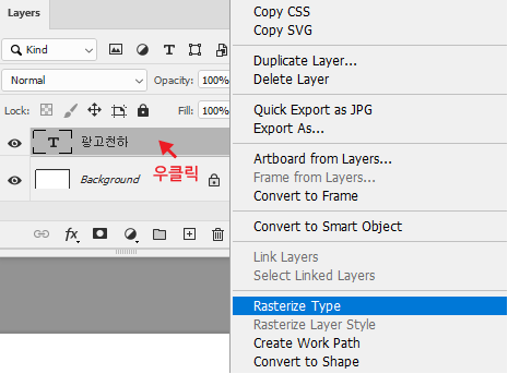 텍스트 레이어 빈공간을 우클릭하신 후 Rasterize Type(문자 레스터화)를 누르시면 됩니다.