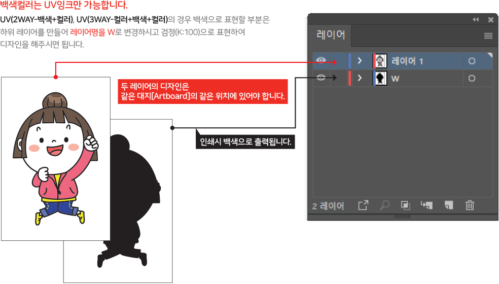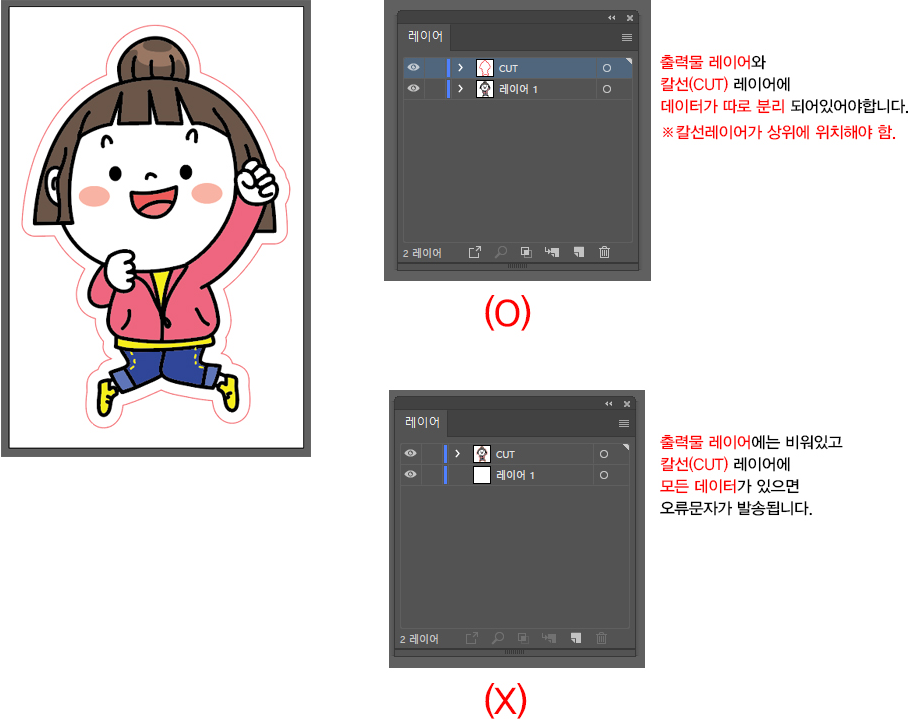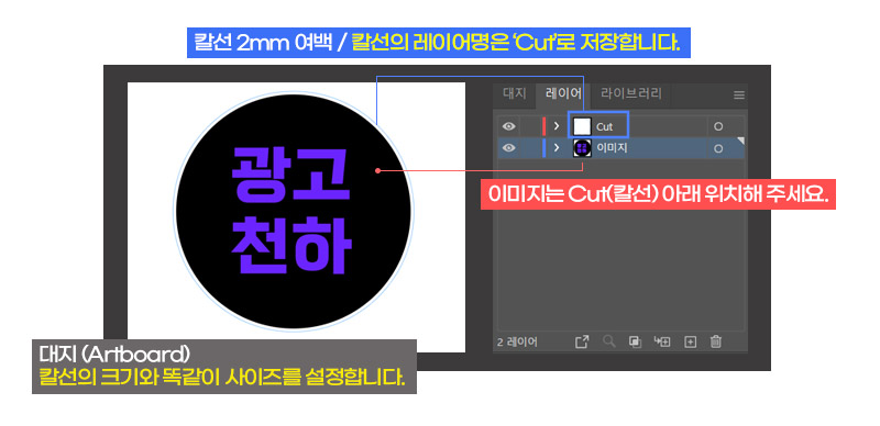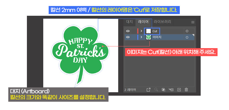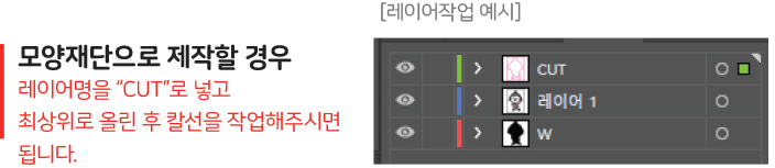칼선과 시안이미지를 구분해주시기 바랍니다. 칼선레이어 이름을 반드시 ‘Cut’ 으로 해주셔야 칼선이 자동생성됩니다. (대소문자 구분없음)