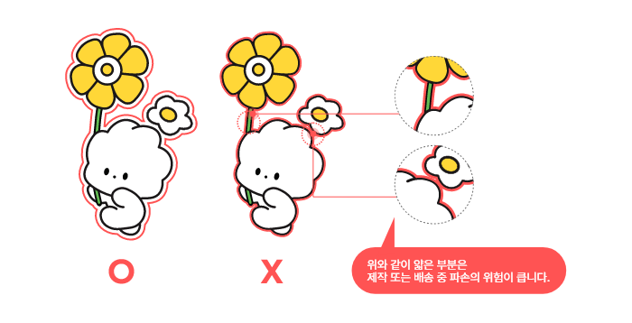 최소 2cm 정도의 흰 여백을 주어 칼선을 단순하게 하셔야 재단 중 떨어져 나가거나 배송 중 파손될 확률이 적습니다.