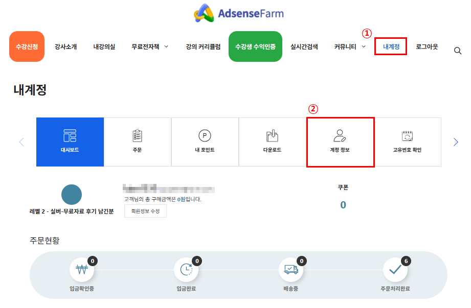 로그인 후 화면 상단(또는 우측 상단) 메뉴에서 “내계정” →"계정정보” 메뉴로 이동합니다.
