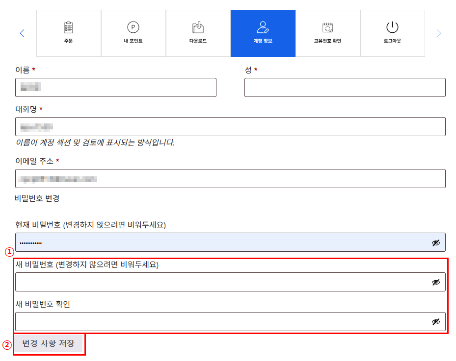 현재 비밀번호를 입력한 후, 변경을 원하시는 새 비밀번호를 입력합니다.