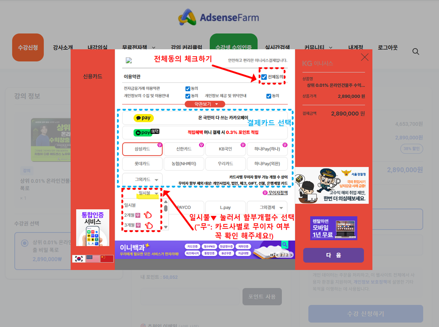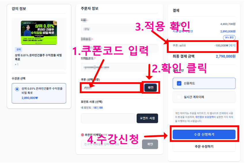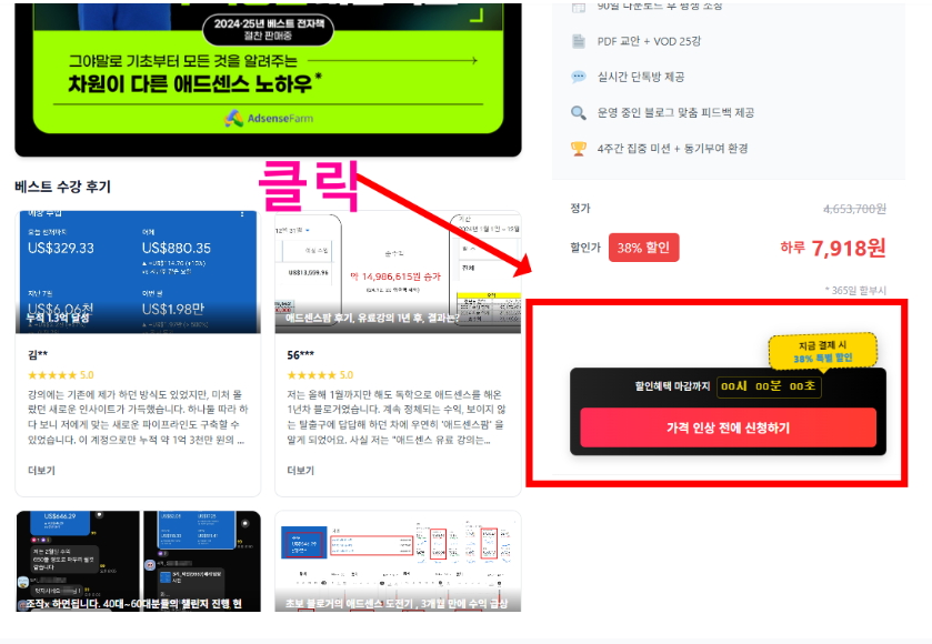 애드센스팜 강의를 가장 저렴하게 수강하는 방법! 할인쿠폰 적용부터 결제까지의 과정을 안내해 드립니다.