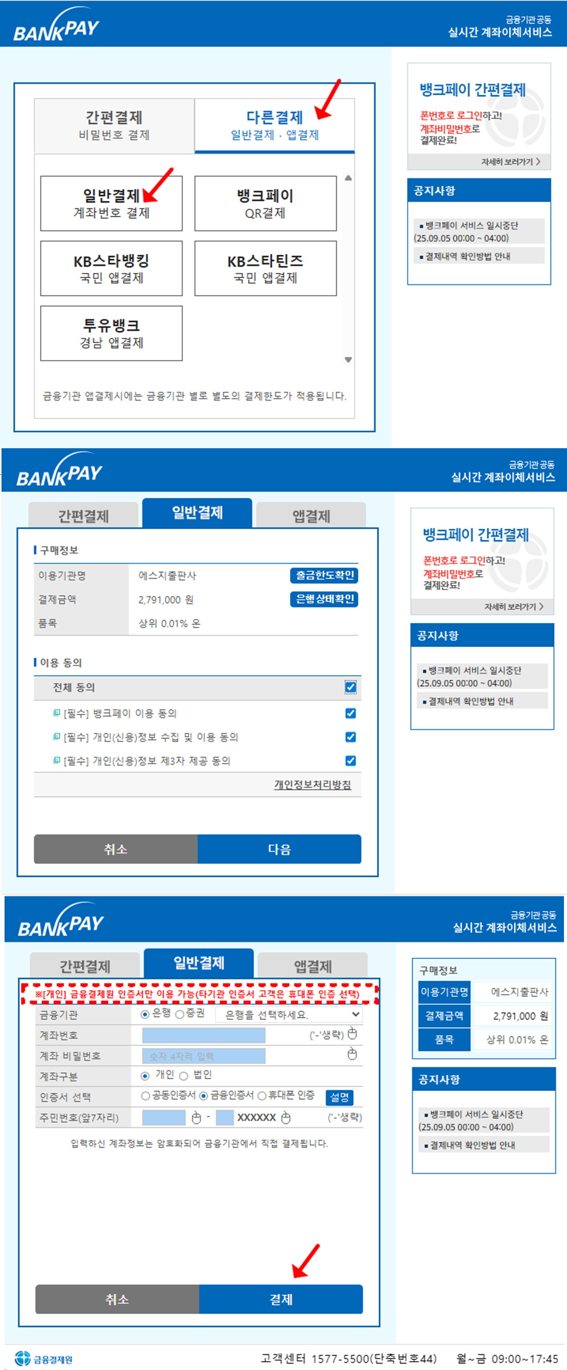 하단에서 [일반결제 (계좌번호 결제)] 클릭