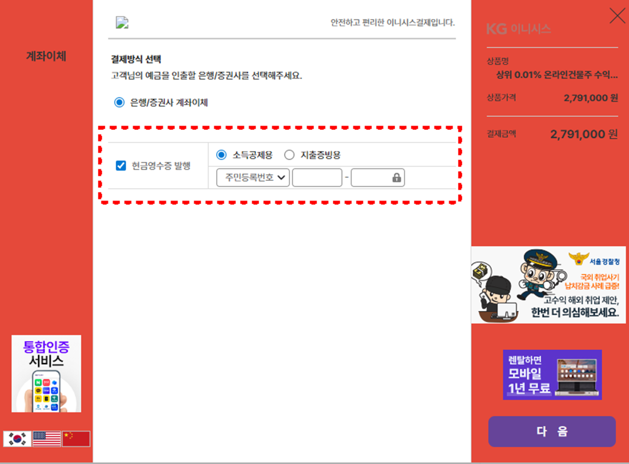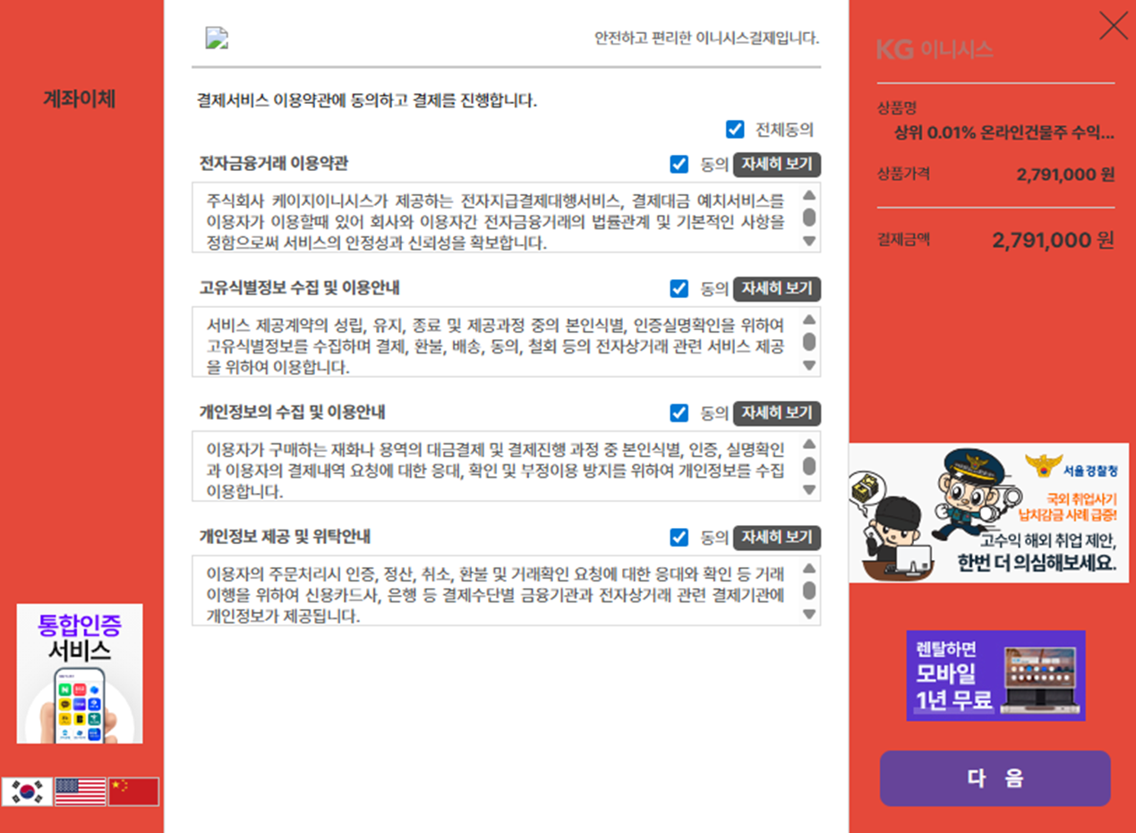 결제 페이지에서 [계좌이체]를 선택합니다.이용약관 및 개인정보 동의 항목은 전체 동의 후 [다음] 버튼을 눌러주세요.