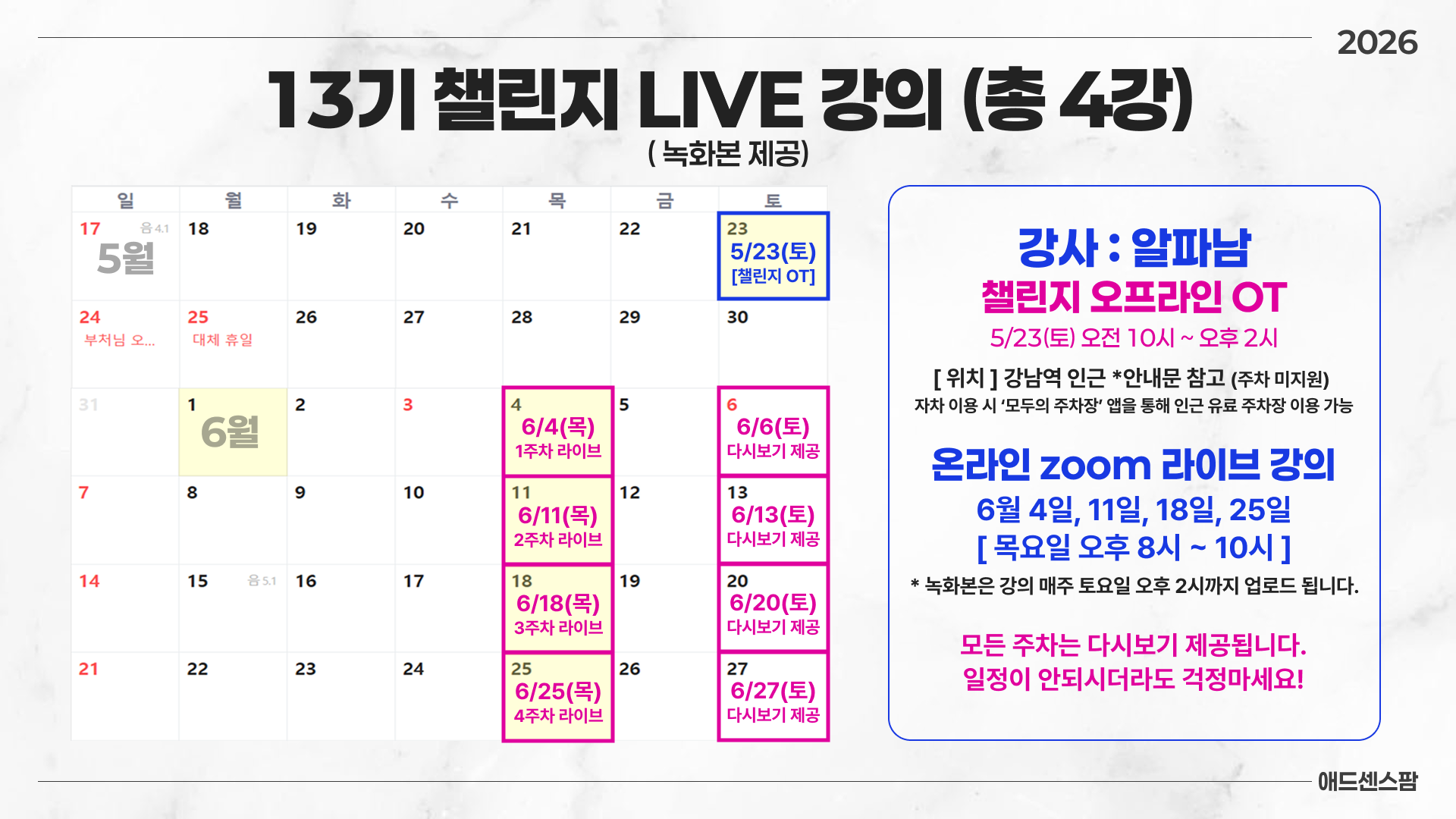 알파남이 직접 출강하는 오프라인 OT 1회, 온라인 챌린지 4회 제공됩니다.