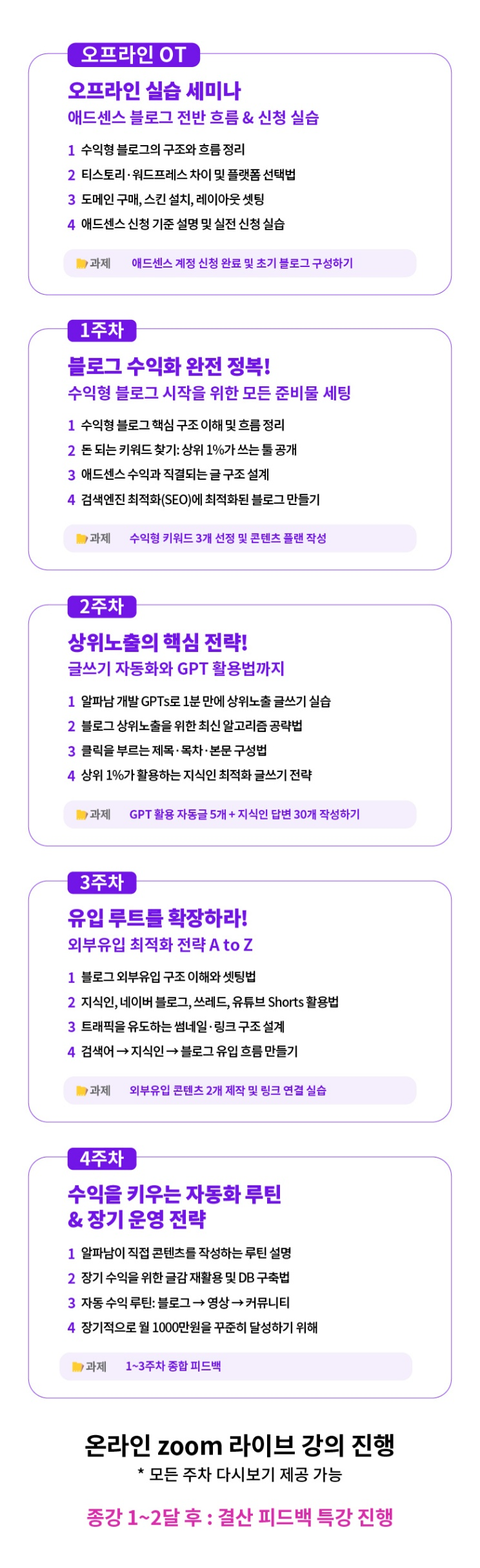 기수별 일정은 변동될 수 있으니, 신청 전 반드시 고객센터로 문의해주세요. 50대 이상 초보자도 쉽게 따라올 수 있는 블로그 수익화 프로그램! 지금 도전해보세요!