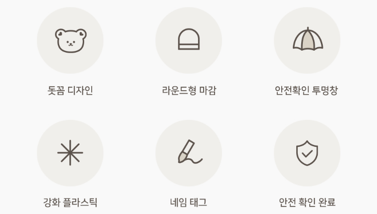 주요 특징: 3D 입체 디자인, 안전 투명창, 라운드형 안전 마감, 강화 플라스틱 우산살