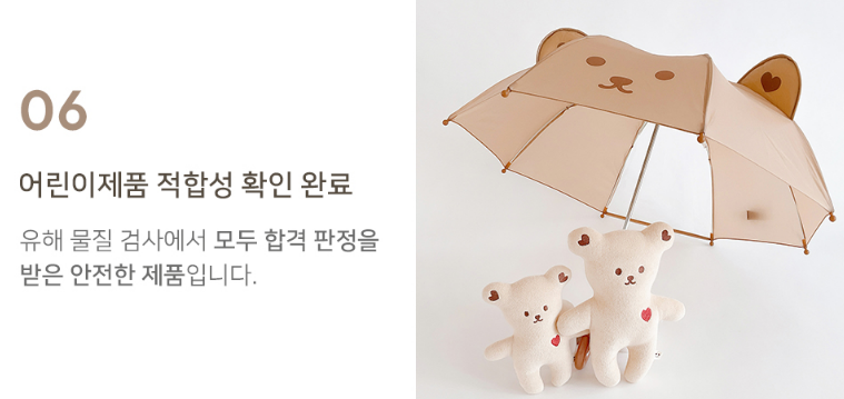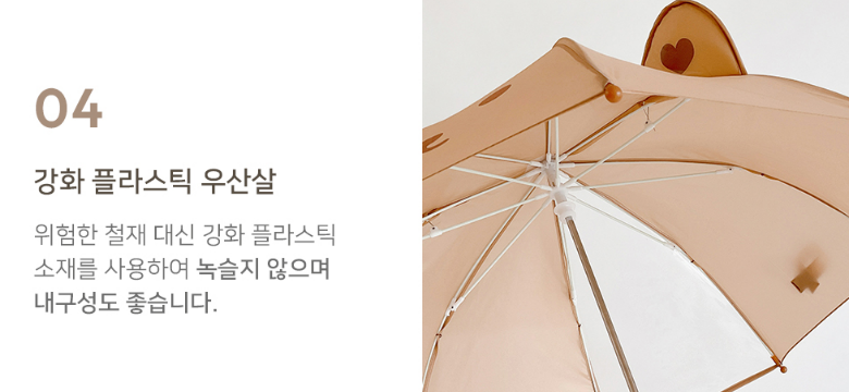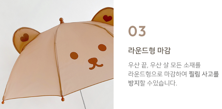 우산 끝부분과 우산 살 등 모든 소재를 날카롭지 않게 라운드형으로 마감 처리하여, 아이들이 사용 중 발생할 수 있는 찔림 사고를 방지합니다.