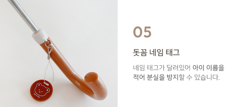 우산 손잡이 부분에 귀여운 돗꼼 네임 태그가 달려 있어, 아이의 이름을 적어둘 수 있어 유치원이나 어린이집 등에서 분실을 방지할 수 있습니다.