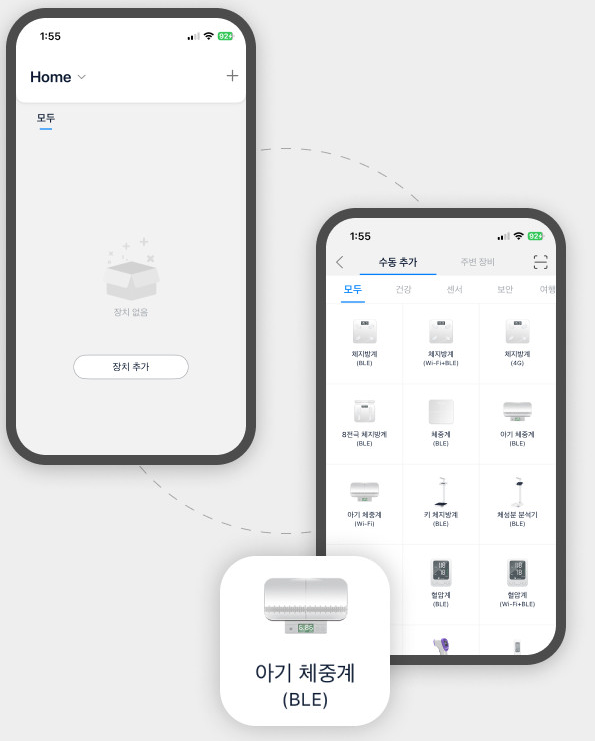3. 목록에서 **'아기 체중계(BLE)'**를 선택하고, 연결 가능한 기기가 뜨면 사용할 위치를 지정하여 등록을 완료합니다. (만약 연결 기기를 찾지 못했다면, 핸드폰 설정 > 앱(AILINK) > 블루투스 접근허용/위치접근 허용이 활성화되어 있는지 확인해주세요