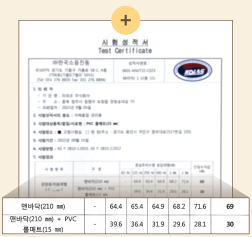 ํ๊ตญ์์์ง๋๊ธฐ๊ด ์ธ์ฆ ์ํ ๊ฒฐ๊ณผ ์๊ณต ์ 69dB โ ์๊ณต ํ 30dB ์ฝ 57% ์์ ๊ฐ์ ํจ๊ณผ๊ฐ ํ์ธ๋์์ต๋๋ค.
