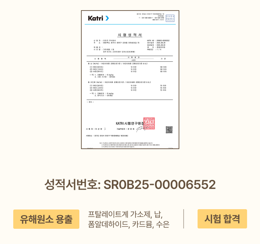 유해 물질 검사에서 합격판정을 받은 안전한 제품입니다.