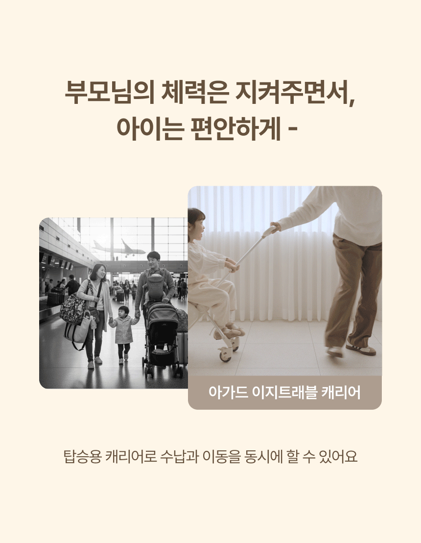 • 공항, 쇼핑몰, 여행지, 놀이공원 등 많이 걷는 장소에서 유모차 대신 편리하게 사용할 수 있습니다.