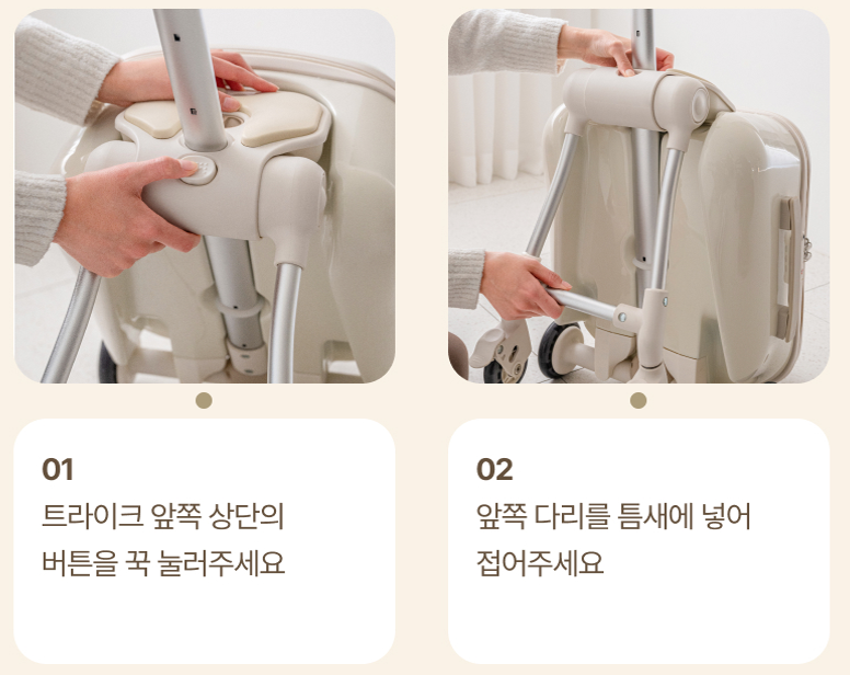 제품의 조립, 분해, 폴딩, 펼침 등의 작업은 반드시 아이가 탑승하지 않은 상태에서 진행해주세요