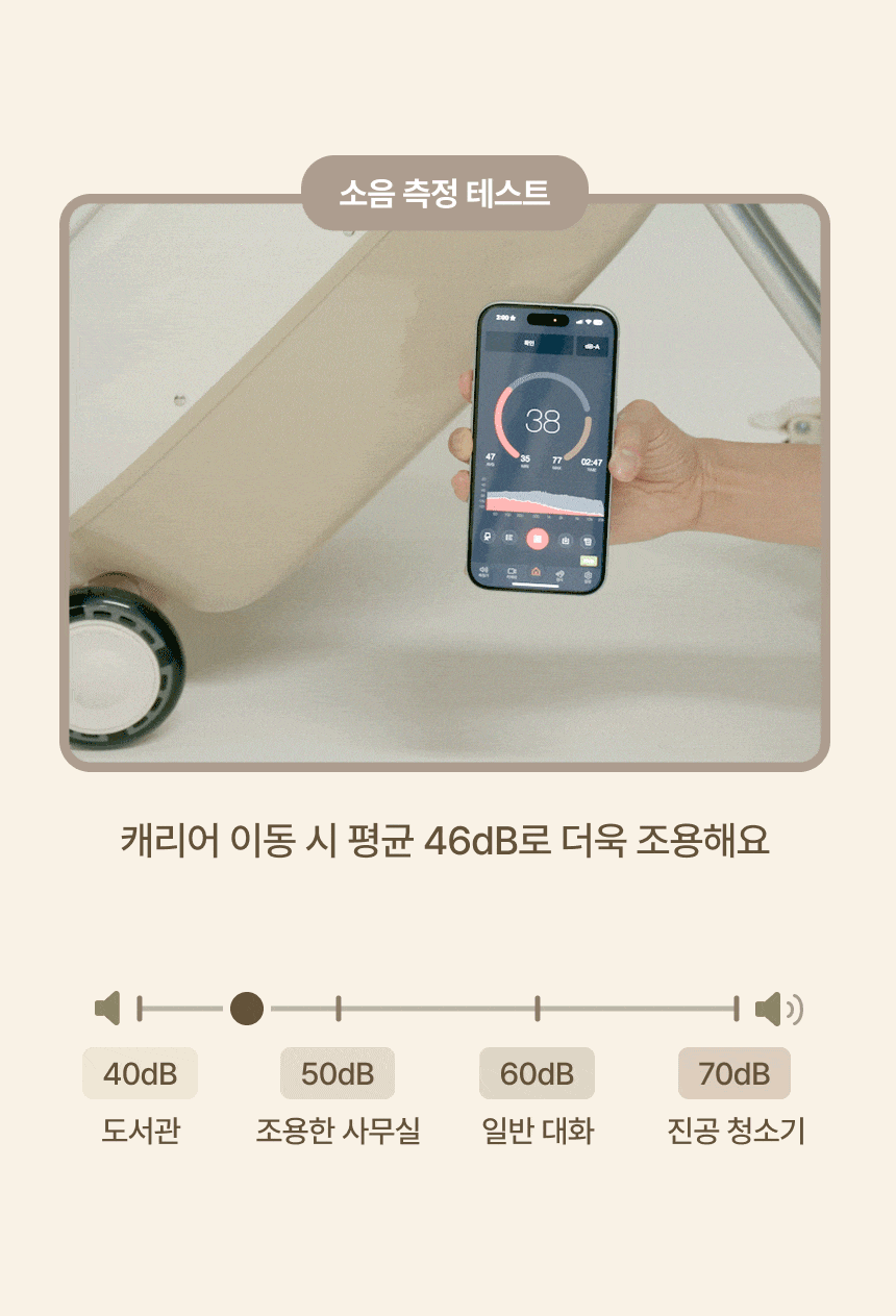 • 부드러운 핸들링과 저소음 설계: 캐리어 이동 시 평균 46dB(도서관 수준)로 조용하고 핸들링이 부드럽습니다.