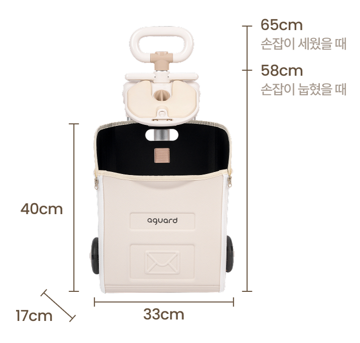 접었을 때(캐리어 + 트라이크 결합): 37cm(폭) x 58~65cm(높이) x 27cm(두께)