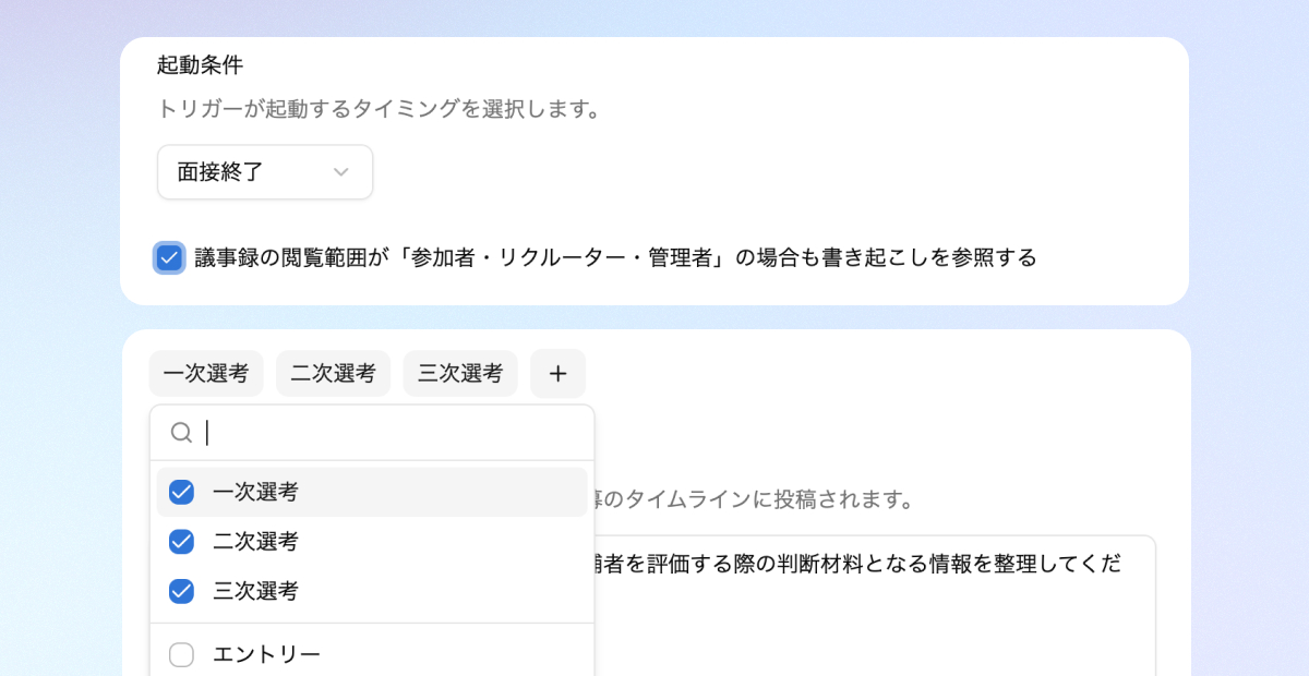 AIリクルーターに自然言語で質問・指示を与えることで、面接準備、評価・申し送り作成、文面作成、選考の振り返りなどを支援します。2件の記事トリガー
