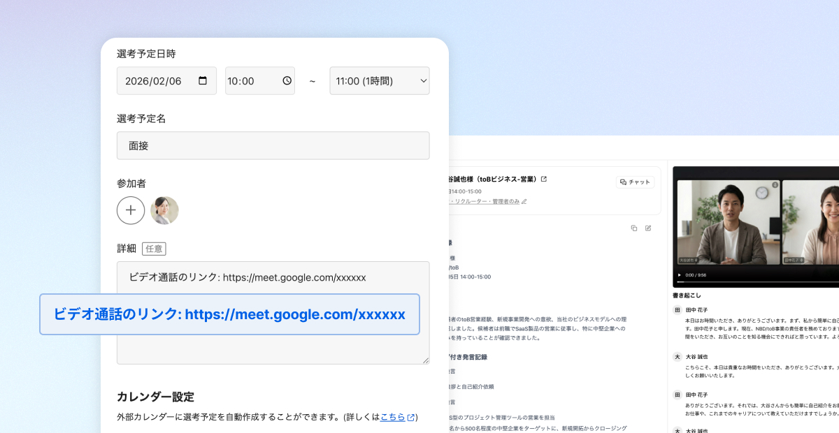 オンライン面接にBotが自動で同席し、面接後約1分で議事録を生成します。チャット