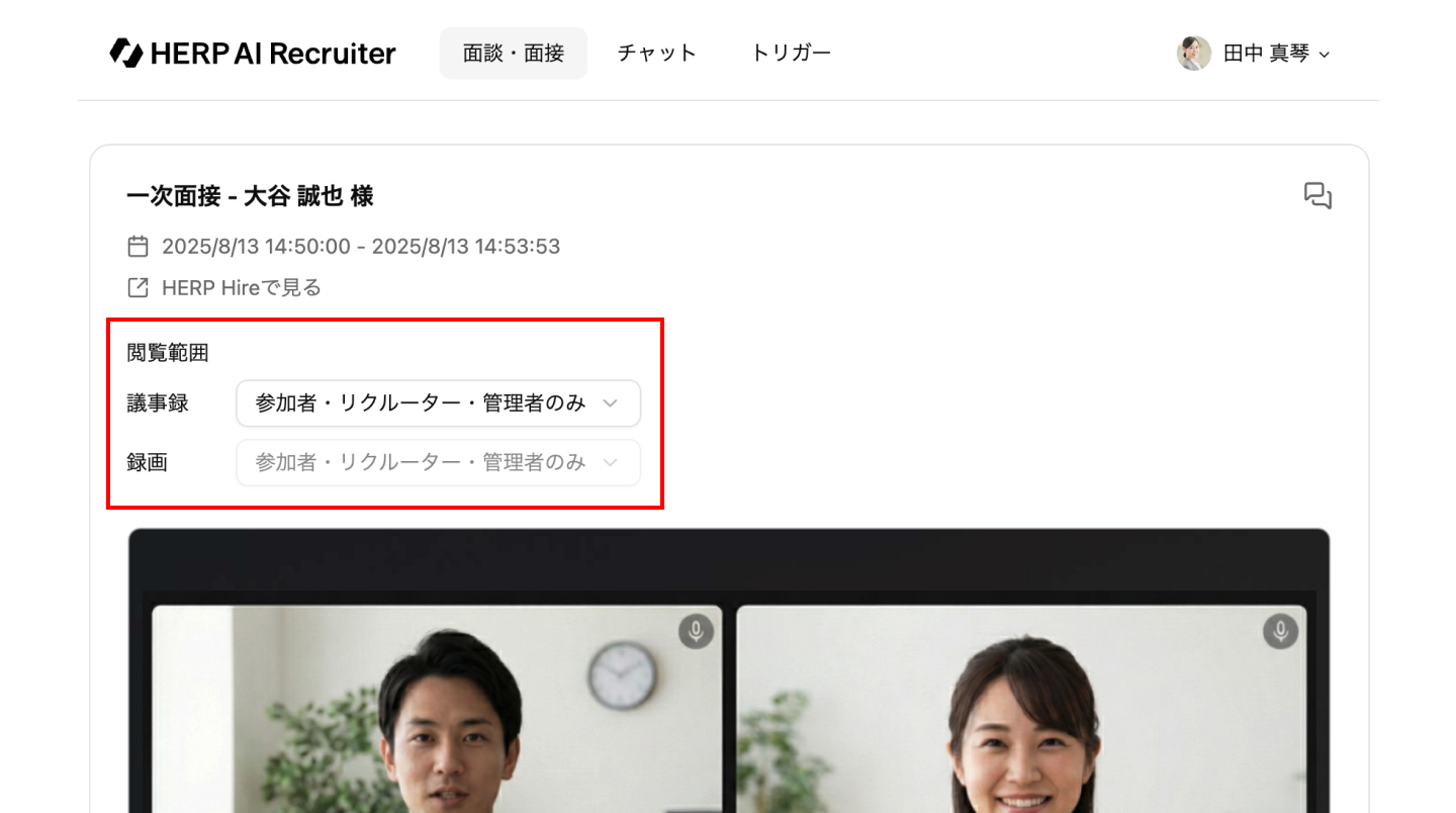 ※ 議事録の閲覧範囲が「参加者・リクルーター・管理者のみ」の場合、録画の閲覧範囲も同様となる