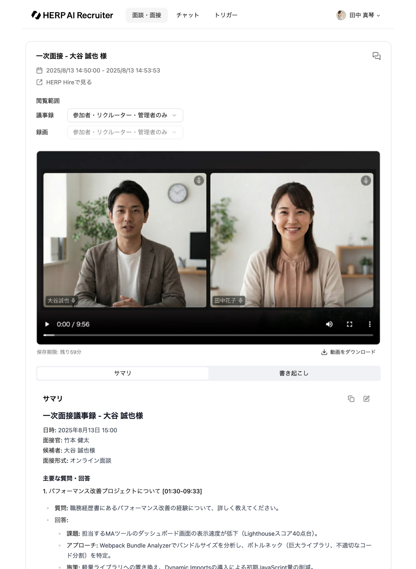 録画は書き起こしと異なり、編集して機微情報をマスクすることができないため、機微情報の意図せぬ漏洩を防ぎたい場合は、録画の閲覧範囲を 「参加者・リクルーター・管理者のみ」にご設定ください