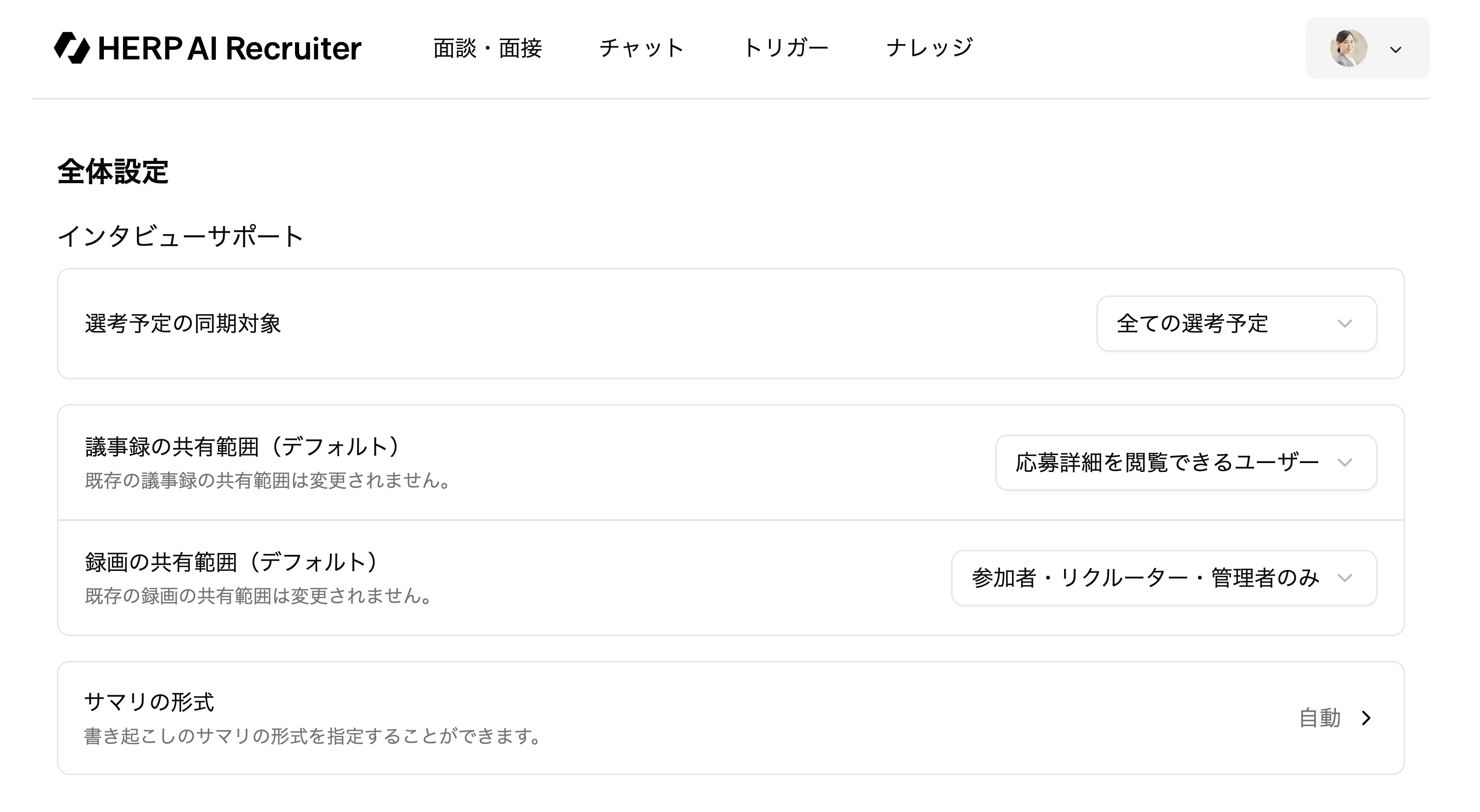 全体設定画面の「インタビューサポート」セクションから「サマリの形式」を選択