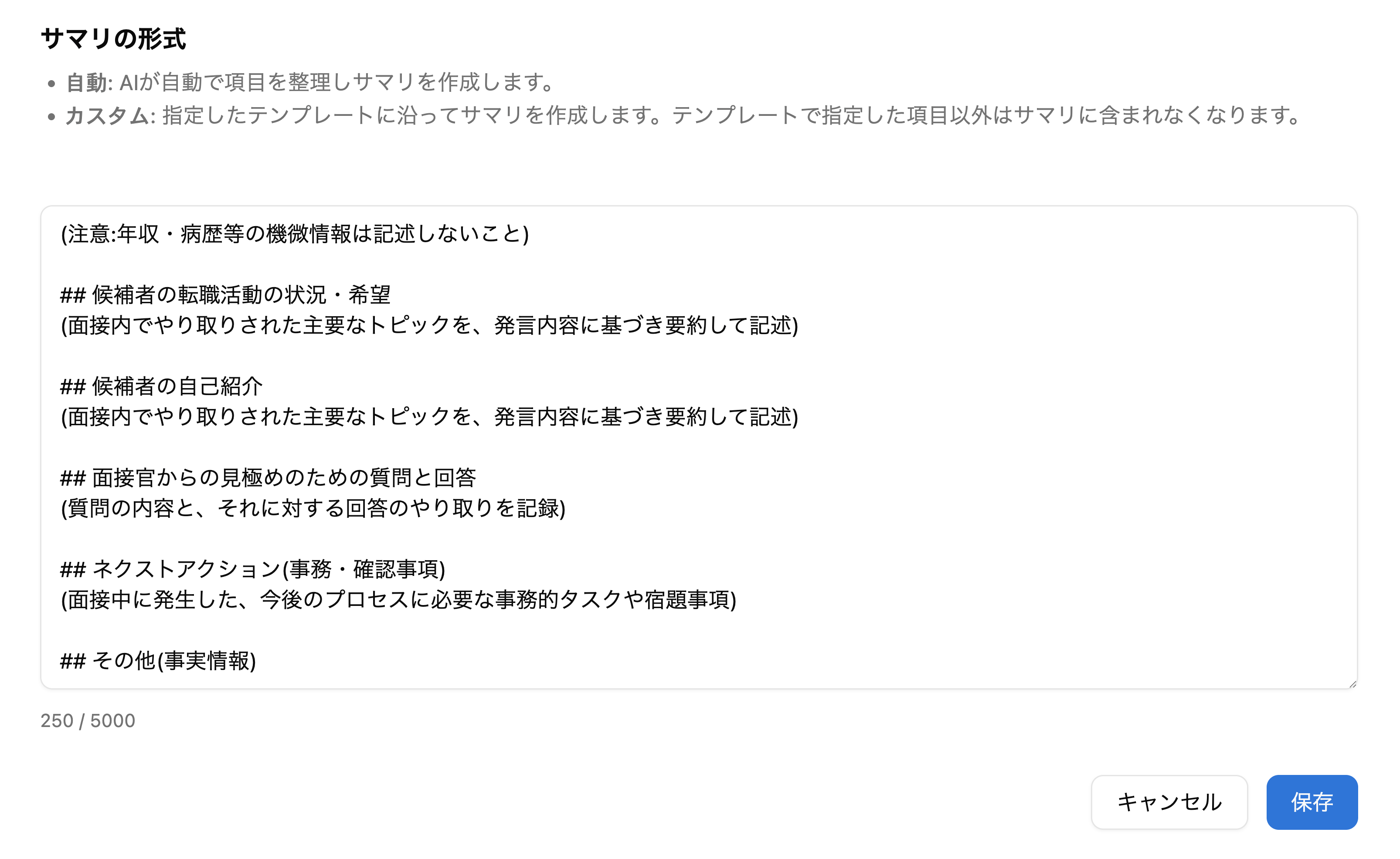 ご不明な点がございましたら、お気軽にお申し付けください。事前にご案内していた通り、弊社の採用業務品質の向上と、今後より良いご案内を行うために録画させていただきたいのですが問題ないでしょうか。面接の書き起こしから生成されるサマリの形式を設定できます。