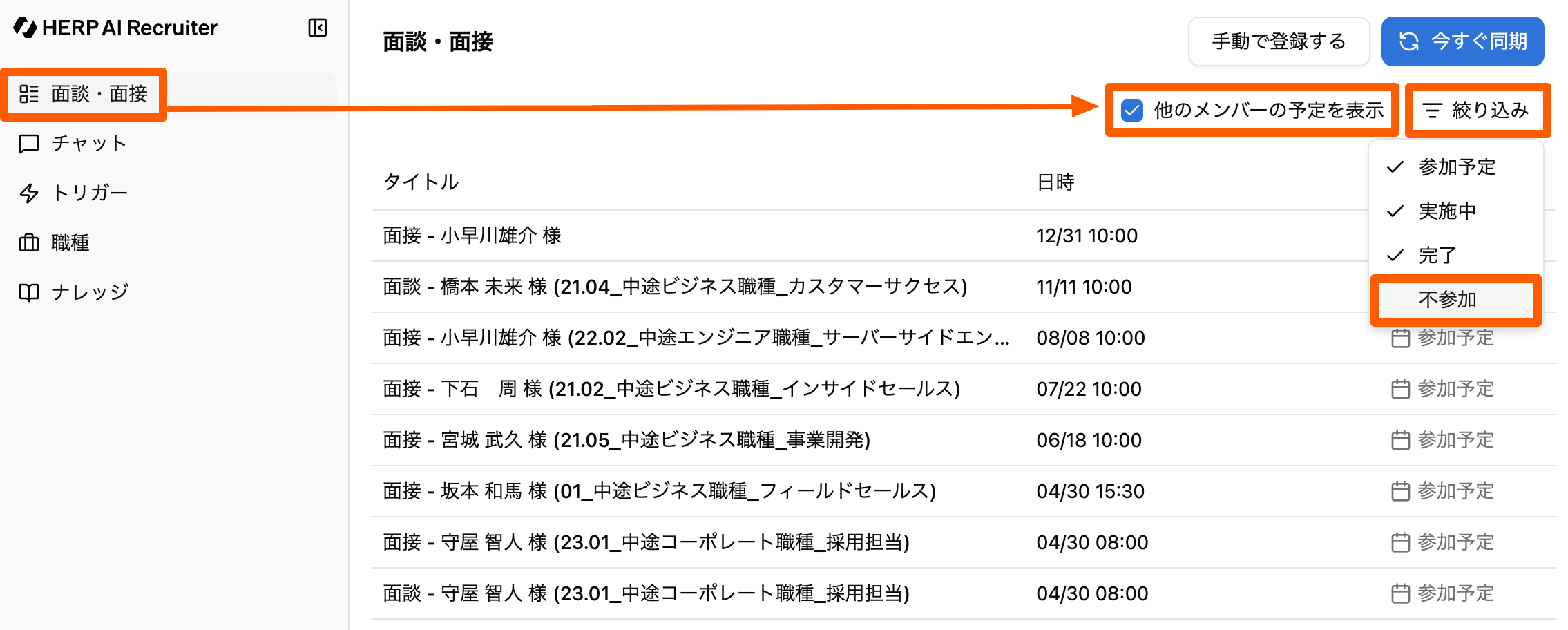 「他のメンバーの予定を表示」にチェックを入れることで、ご自身以外のメンバーの選考予定を含めた一覧を表示できます。