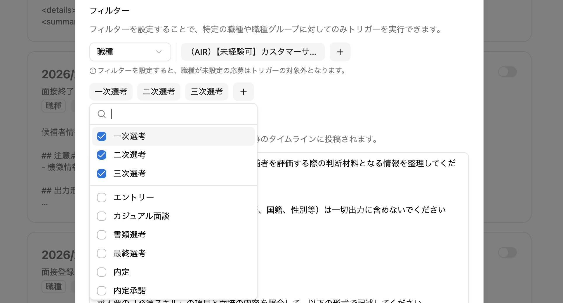 面接登録・面接終了・面接○日前トリガーで選考ステップを指定可能になりました(例:「一次選考ステップのみ」「最終面接ステップのみ」など)。 これにより、選考ステップごとに異なる指示(プロンプト)設定も可能になりました。