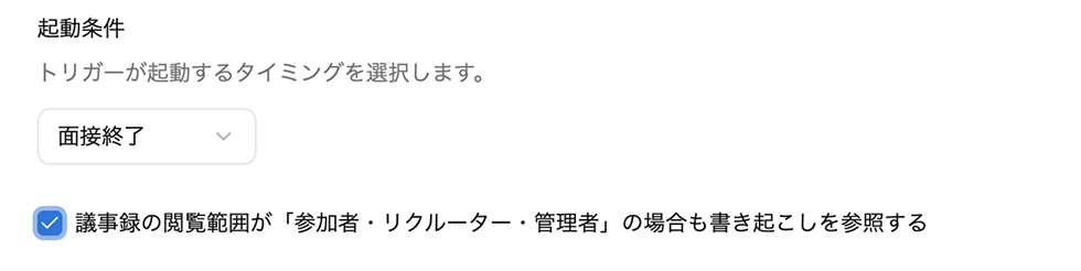 書き起こしの閲覧範囲が「参加者・リクルーター・管理者のみ」の場合も、トリガー側で書き起こし参照を有効化可能に(※面接終了トリガーのみ)。議事録ページの閲覧を制限しつつ、トリガーのコンテキストとして参照させるかどうかを選択可能になりました。