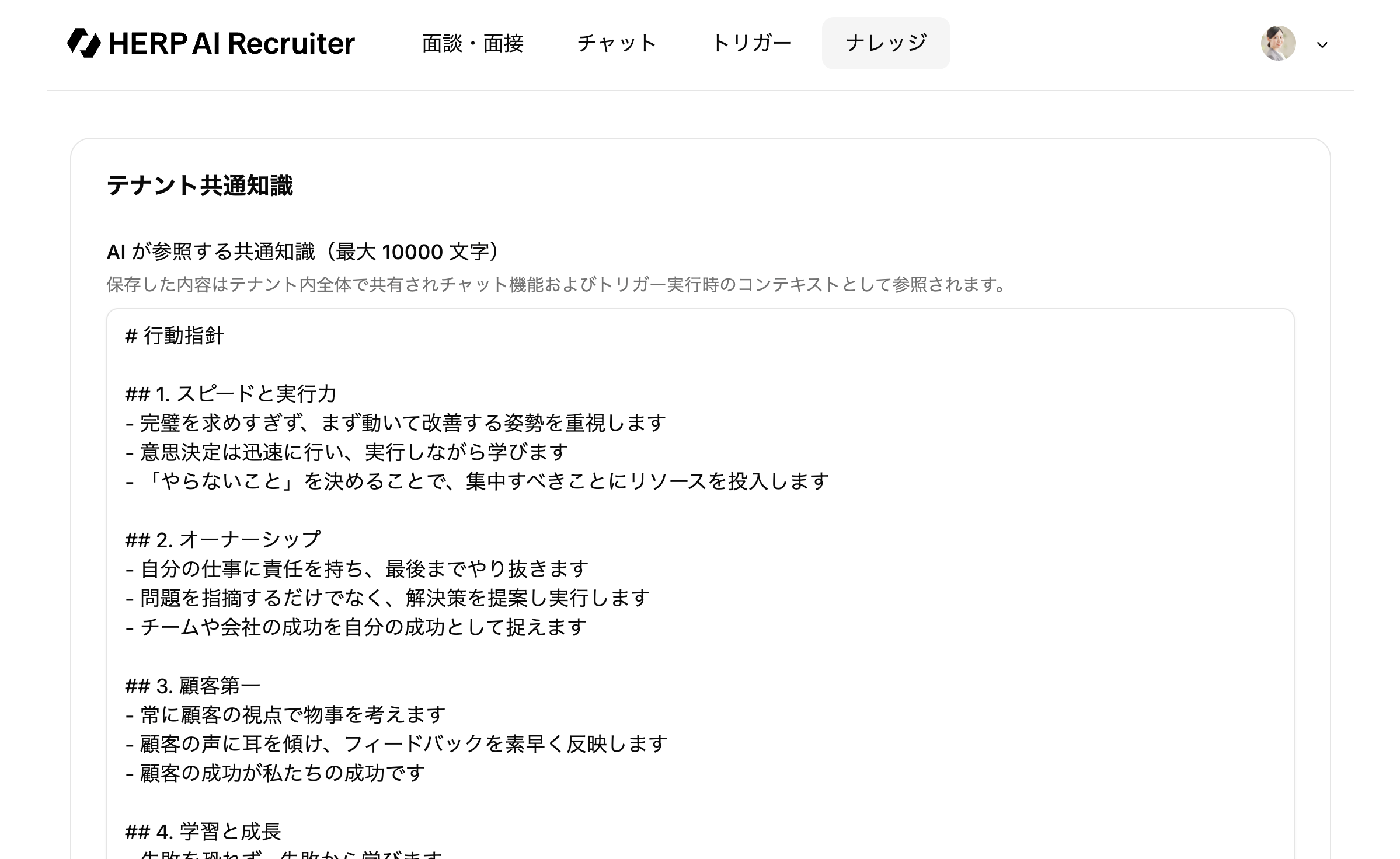 テナント共通知識は、組織全体で共有すべき情報を一元管理する機能です。企業の採用方針、評価基準、組織文化、よくある質問への回答などを登録することで、HERP AI Recruiterが面接やチャットで適切な情報を参照し、一貫性のある回答やサポートを提供できるようになります。