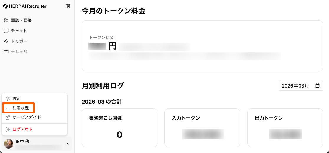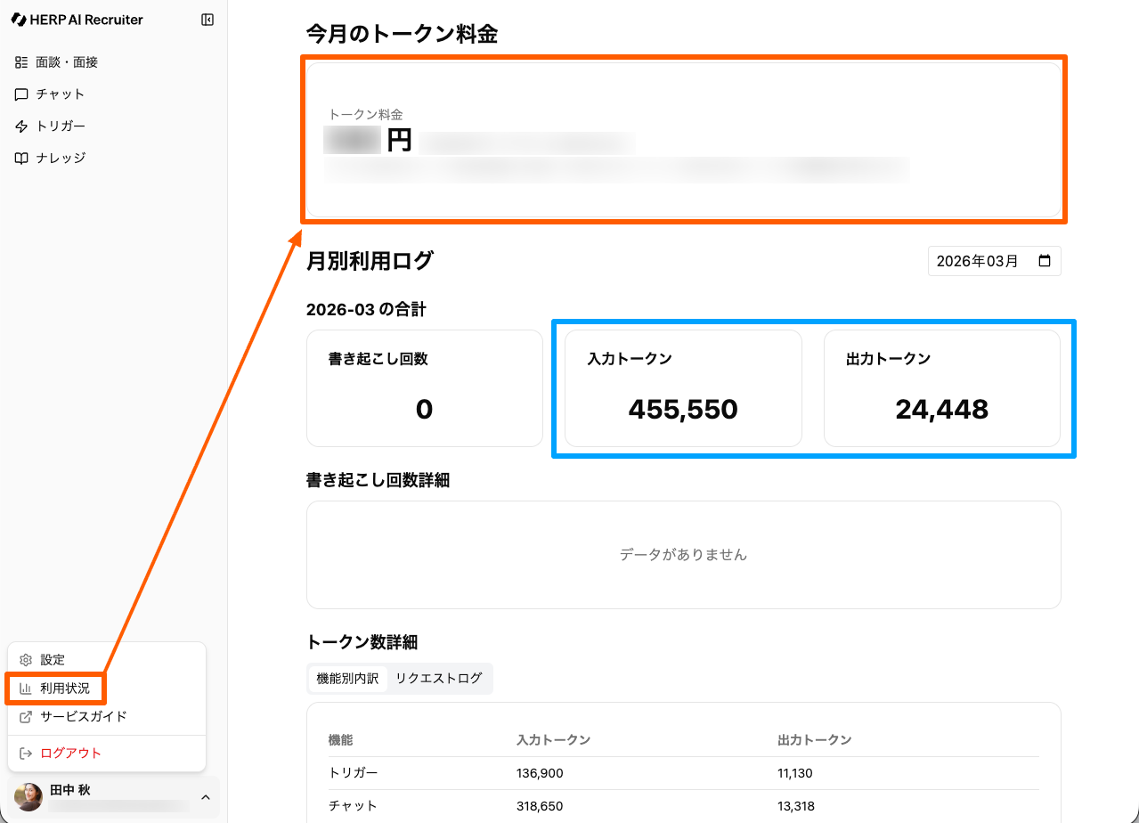 「今月のトークン料金」セクションで金額(円)をご確認いただけます。