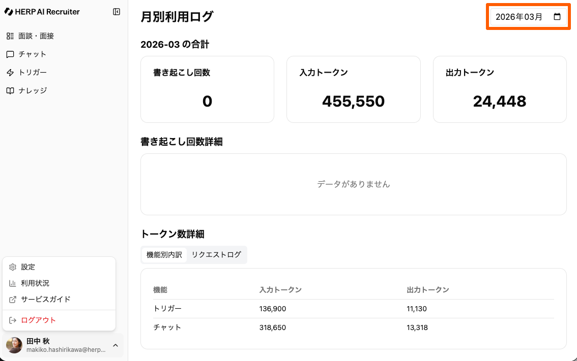 AIリクルーターへ投入したトークン数の合計です。(チャットでのユーザーの手動入力・HERP Hire 上の書類やタイムラインなどの情報 等)