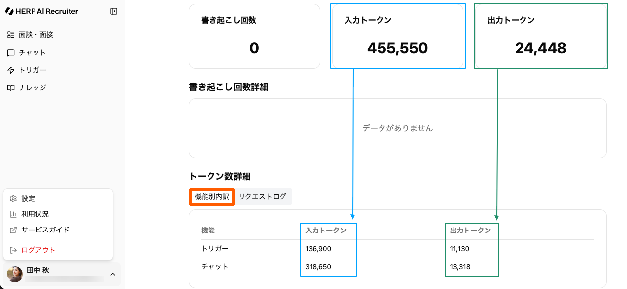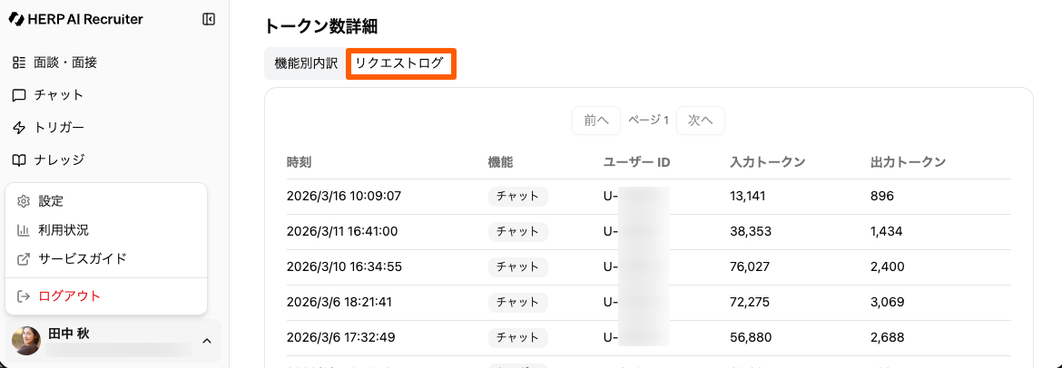 どのユーザーがどの機能を使ったか・トークンをどのくらい消費したかをご確認いただけます。
