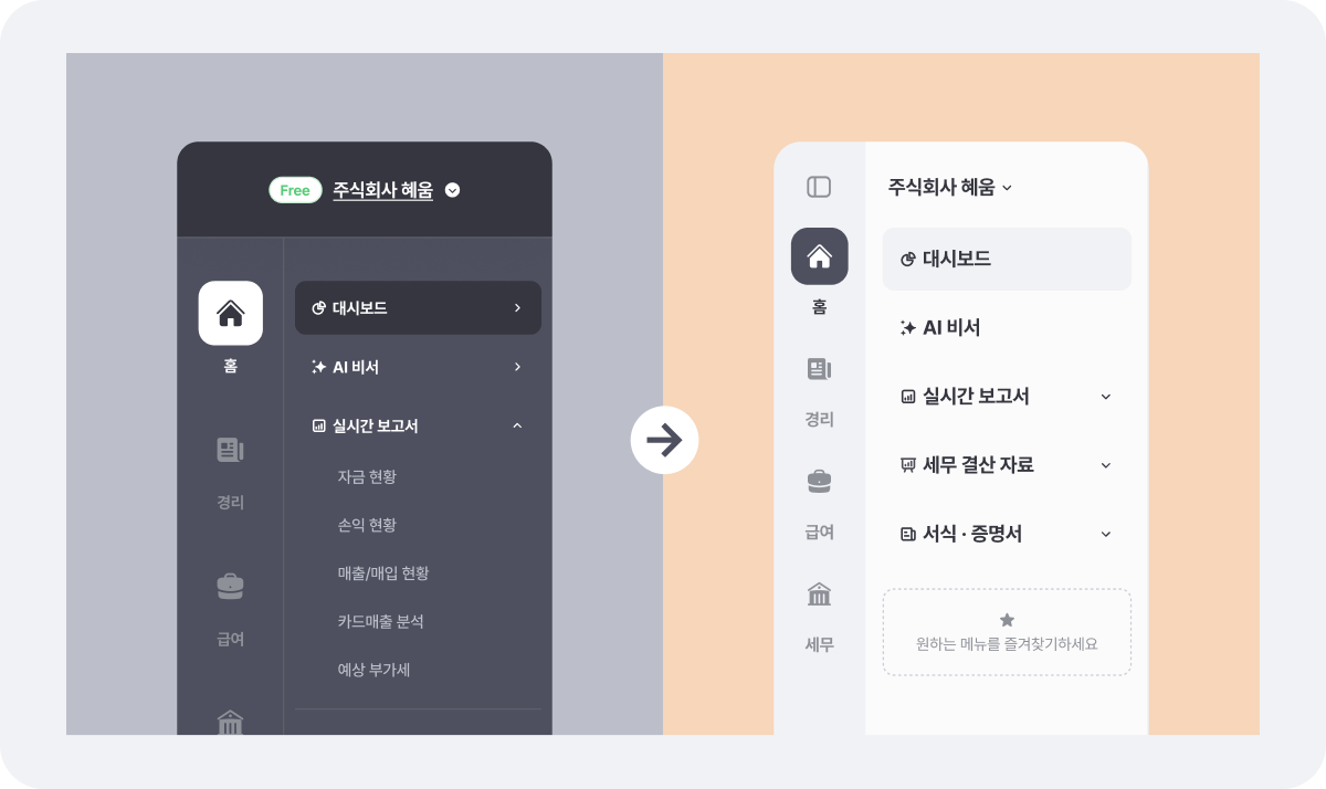 그동안의 개선 요청 사항을 반영하여 이루어진 시인성 강화, 메뉴명 표시 등 메뉴 개편으로 더 쾌적한 화면을 경험 할 수 있습니다.