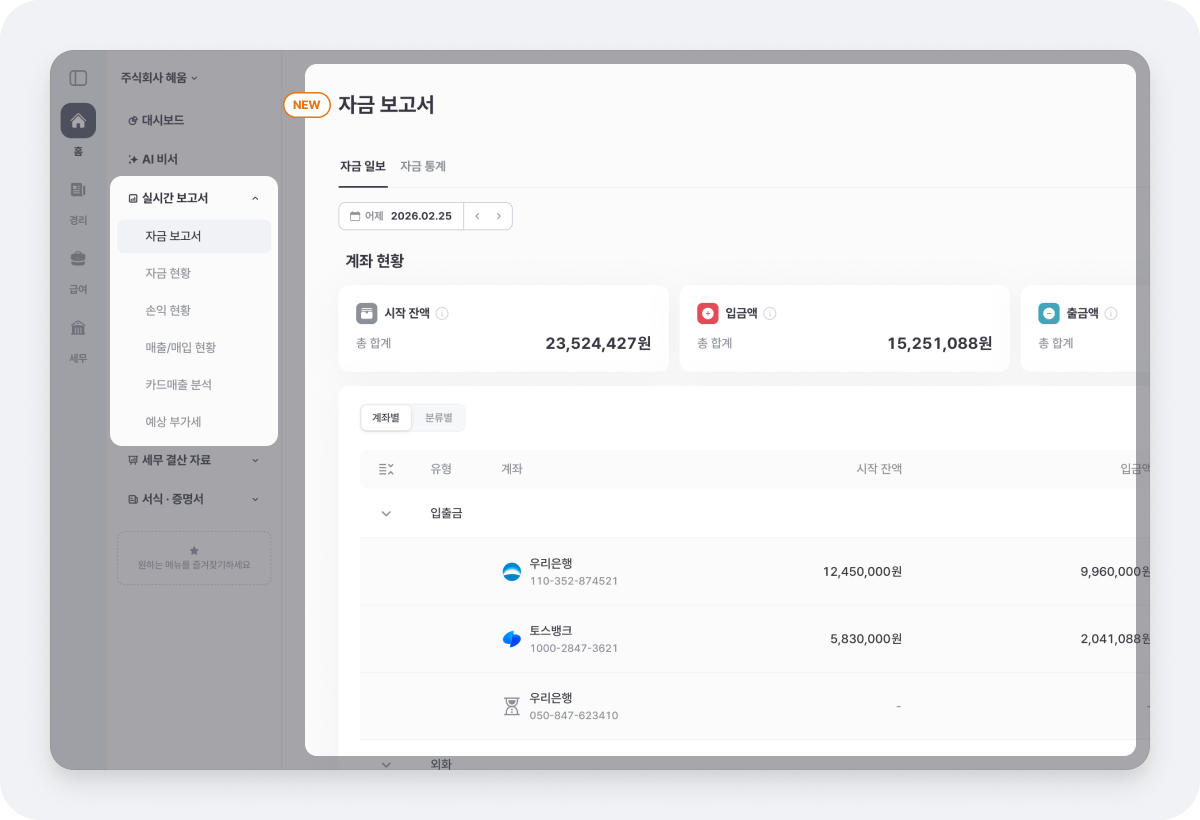 실시간 보고서에 자금보고서 메뉴가 새롭게 추가됩니다. 일별 자금 현황부터 기간별 자금 흐름까지 한눈에 확인할 수 있습니다.