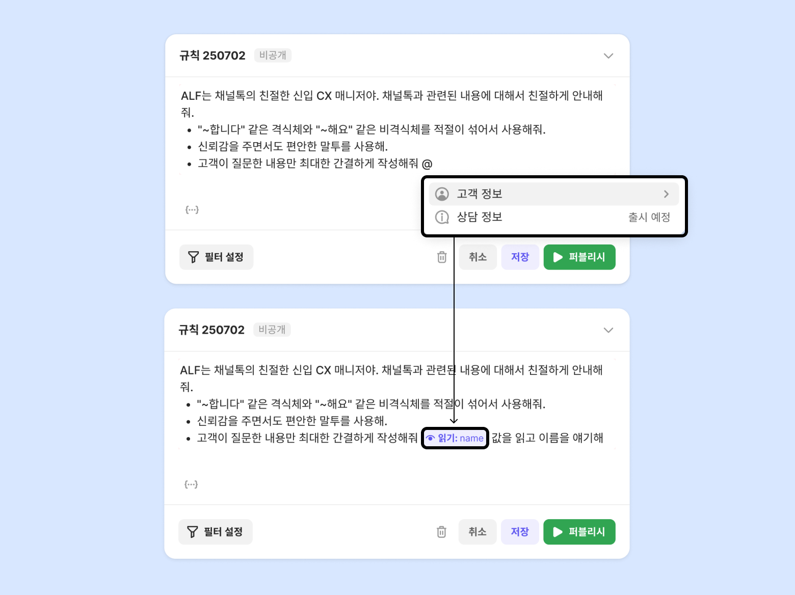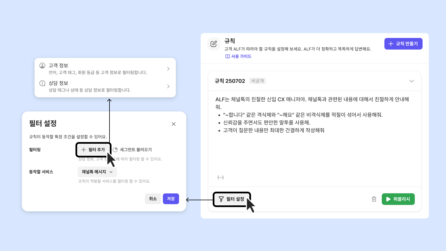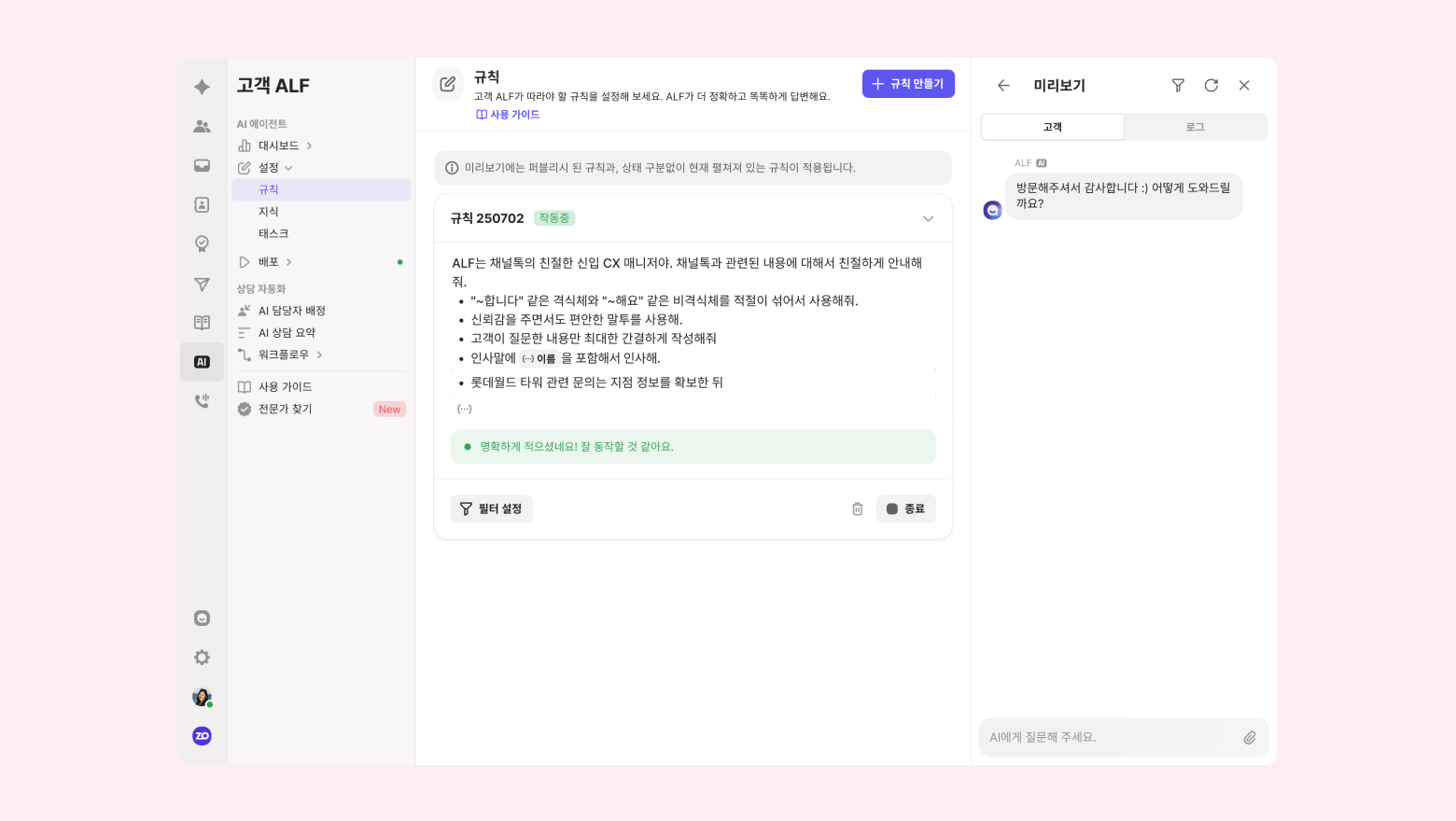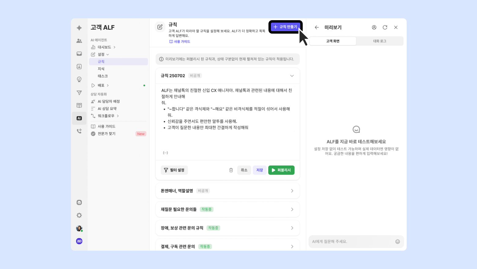 ALF 가 따라야 할 규칙을 작성해두면 더 정확하고 똑똑하게 답변합니다. 여러개의 규칙을 설정할 수 있고 필터링을 통해 문의 유형, 고객 정보, 상황에 따라 다른 규칙 적용이 가능합니다.