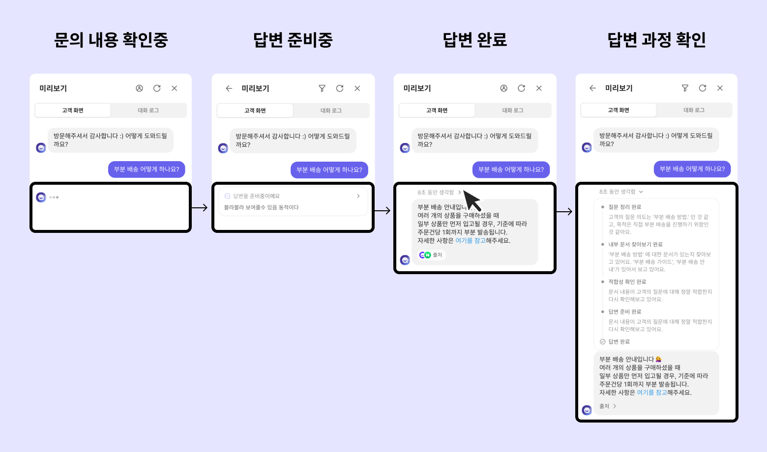 미리보기에서는 [작동중] 상태의 규칙, 미리보기 채팅이 시작되는 시점에 펼쳐져있는 규칙만 답변에 적용됩니다.