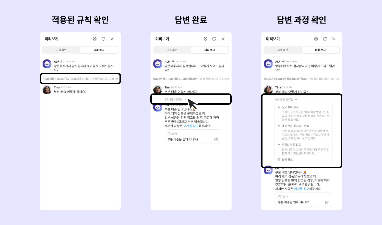 각 답변에 어떤 규칙이 적용되었는지 자세히 확인할 수 있습니다.
