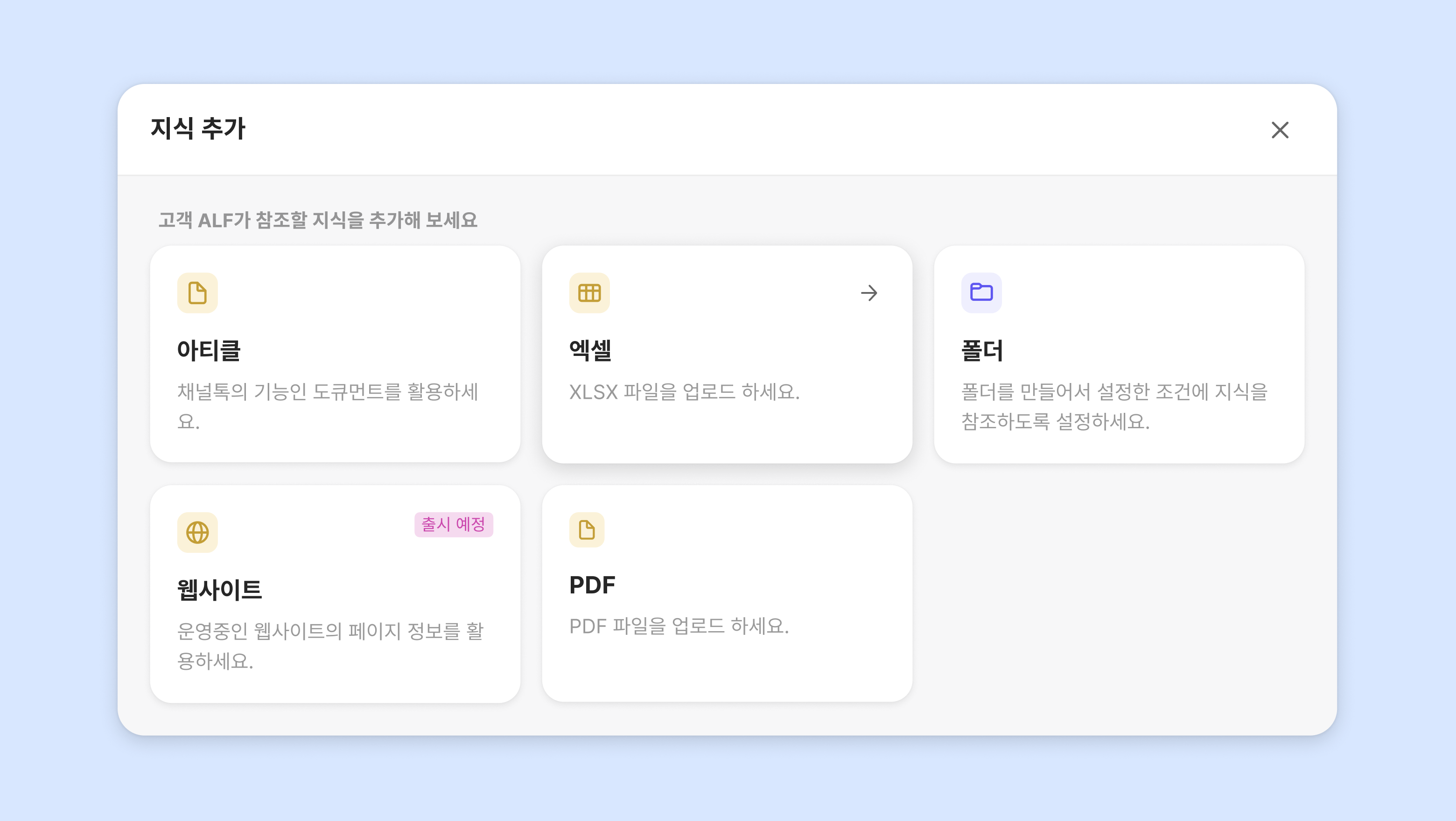 지식 항목은 추후에 웹사이트, 구글 스프레드 시트 등 다양한 지식 유형을 추가할 수 있도록 확장될 예정입니다.