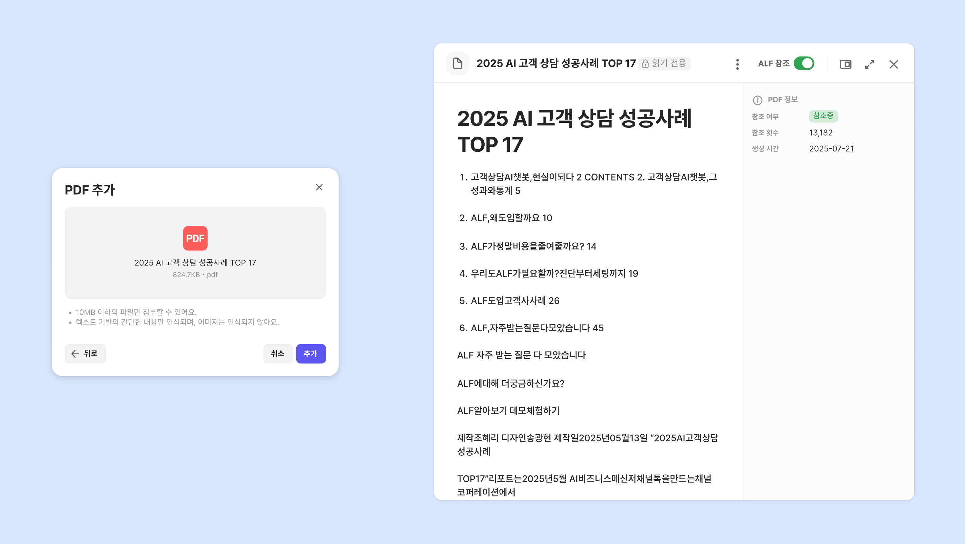 PDF 내 이미지, 표, 레이아웃 등은 인식되지 않고, 텍스트 콘텐츠만 ALF가 참조할 수 있습니다. 텍스트 외 이미지 인식 등은 향후 업데이트에서 지원될 예정입니다.