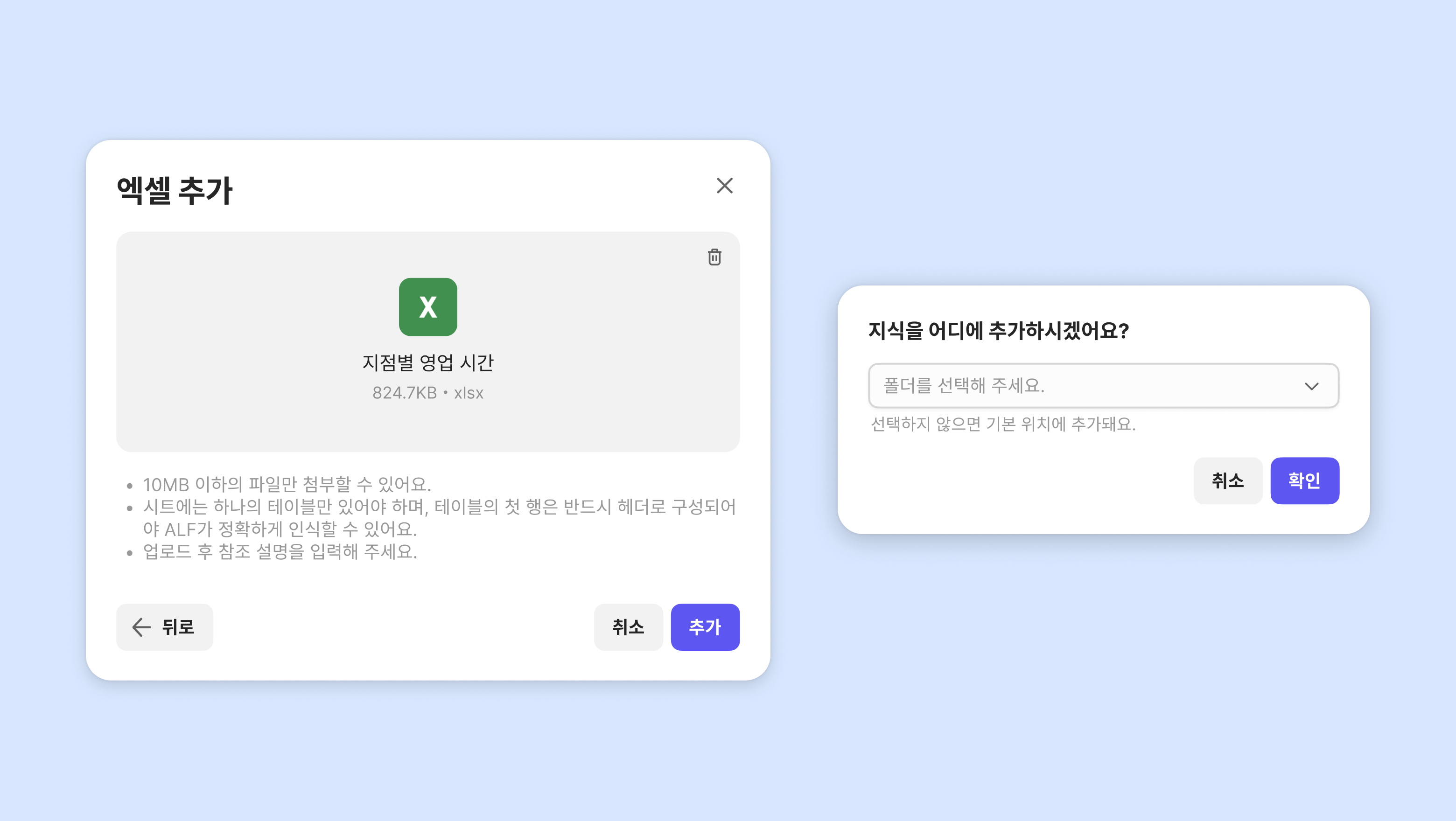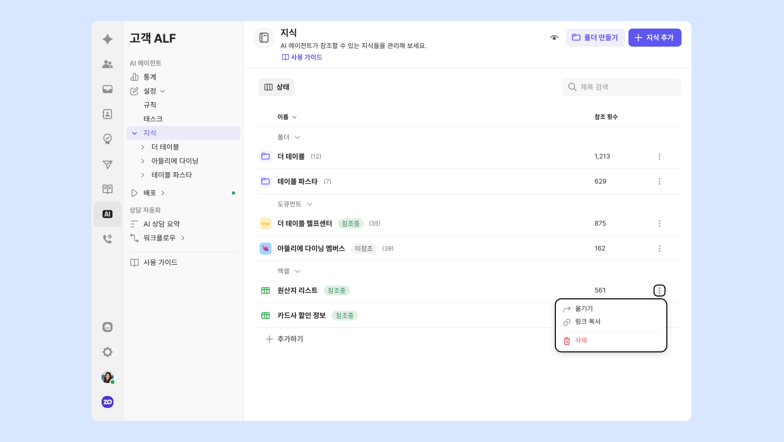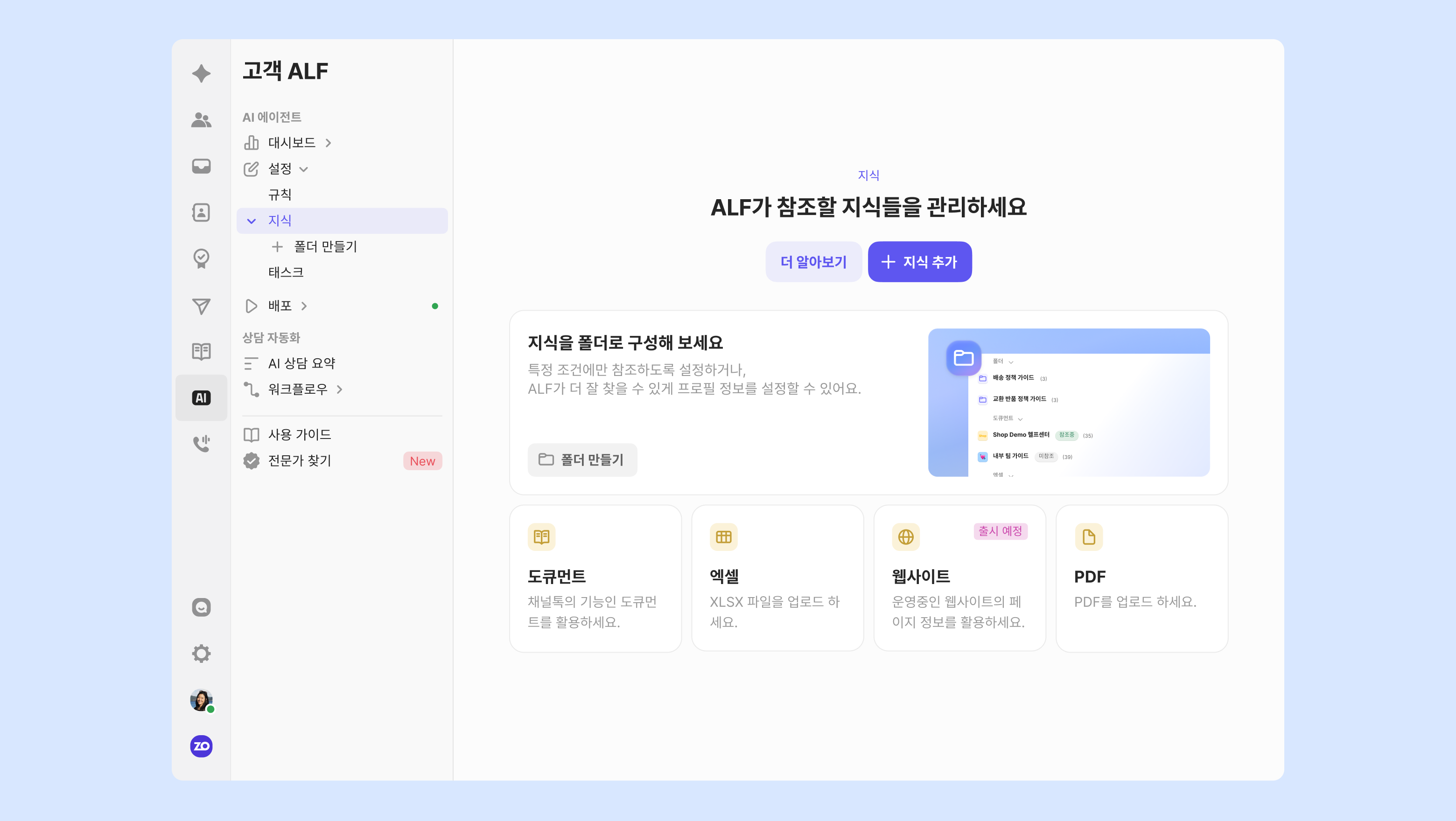 지식은 ALF가 참조할 수 있도록 문서, 파일, 웹사이트 등 다양한 자료를 모아 관리하는 공간입니다.