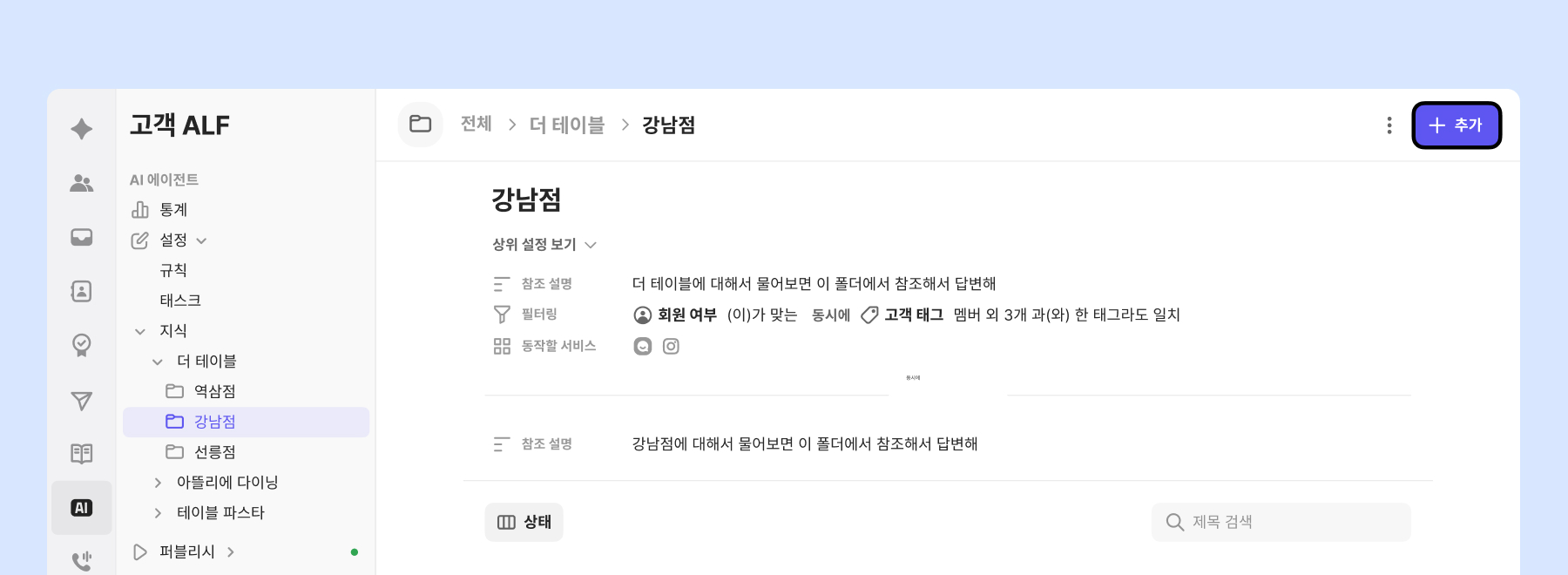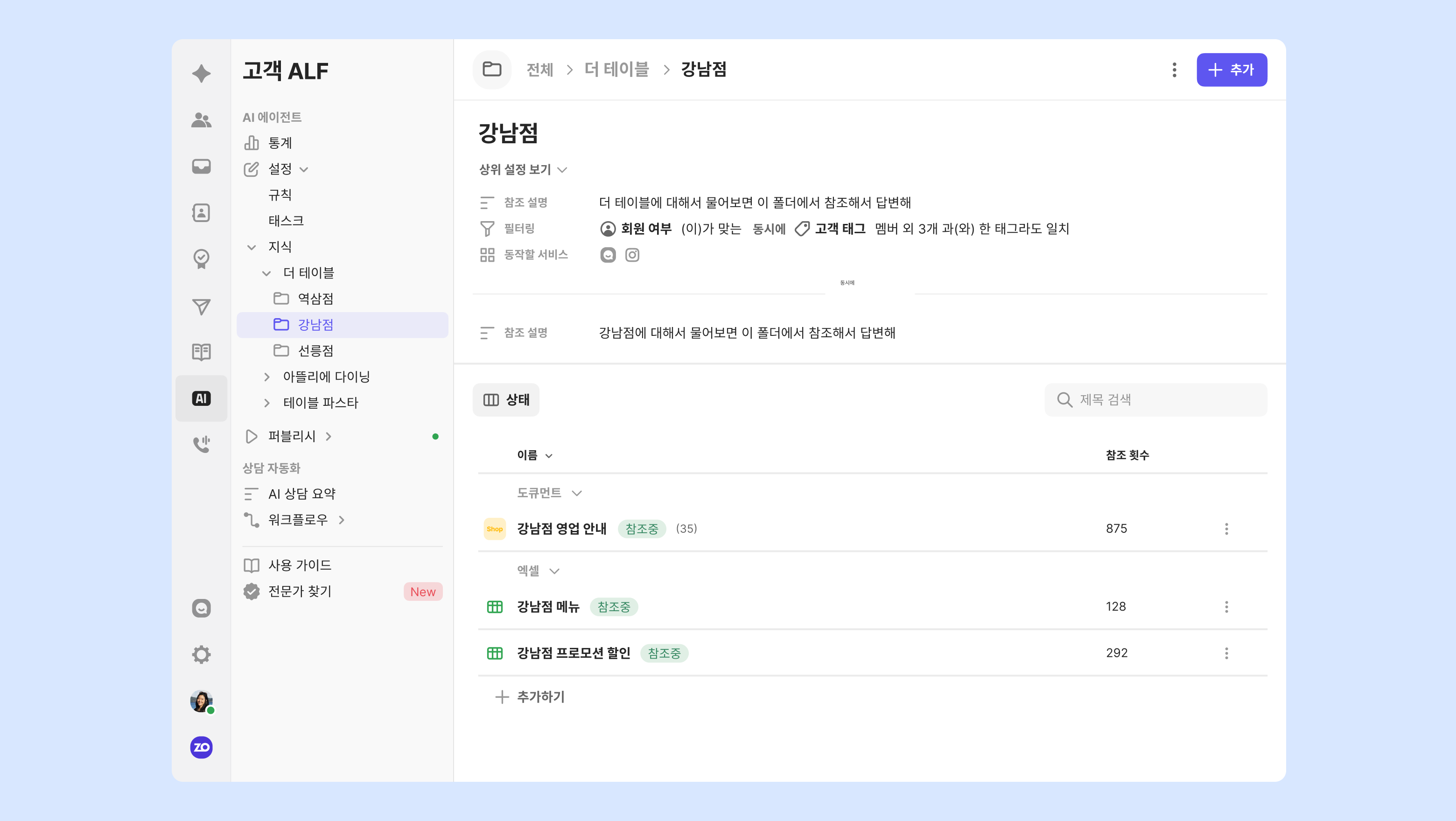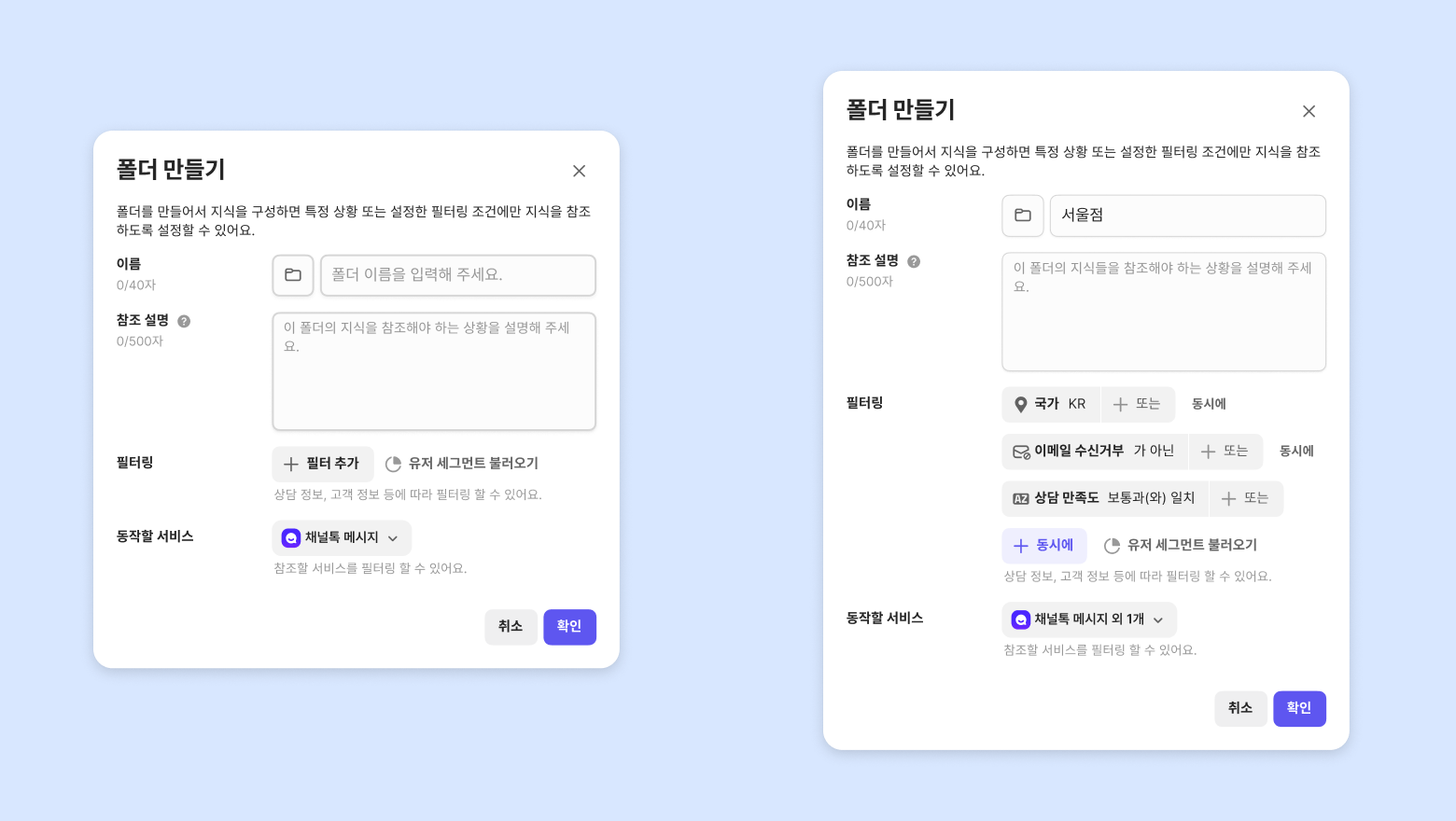 각 폴더에는 참조 설명을 작성하거나, 필터링 조건을 설정하여 상황별로 다른 지식을 참조하도록 제어할 수 있습니다.